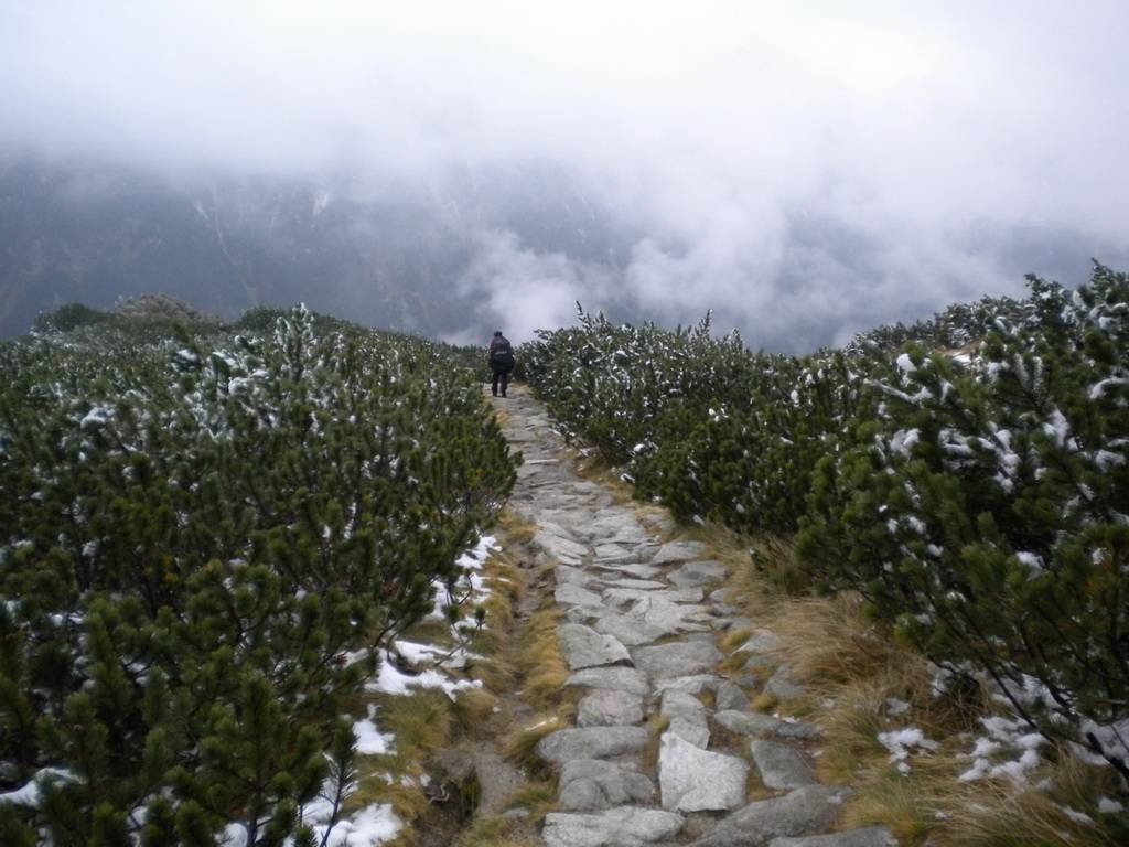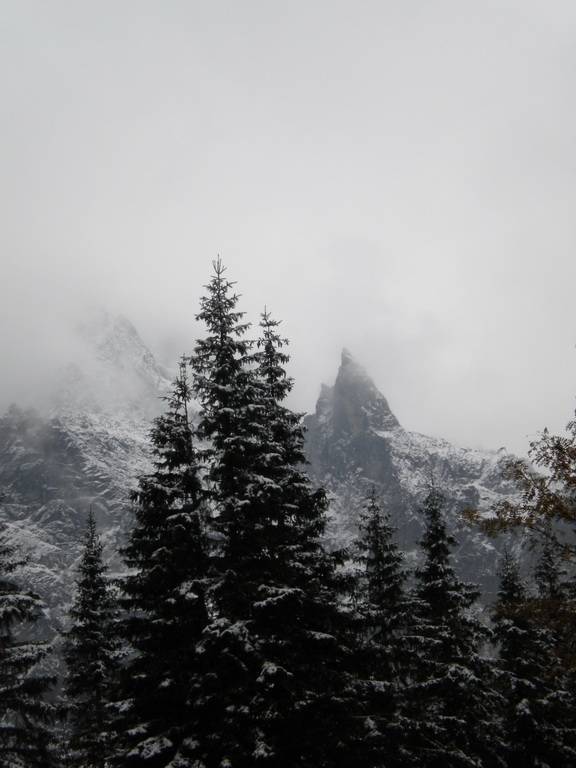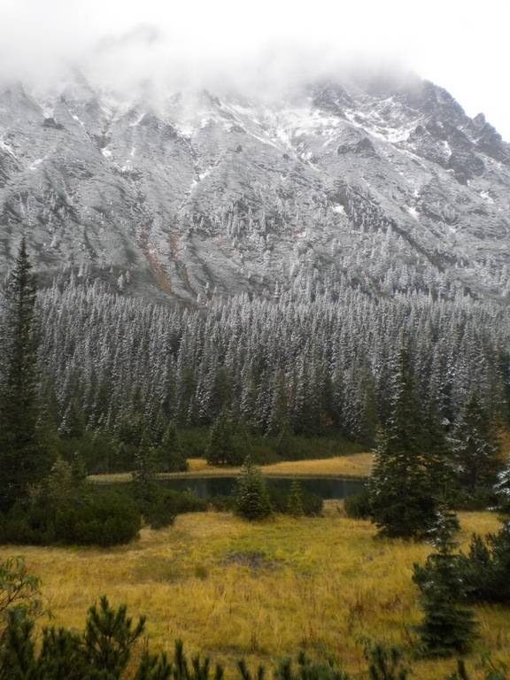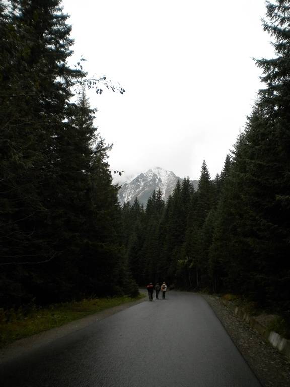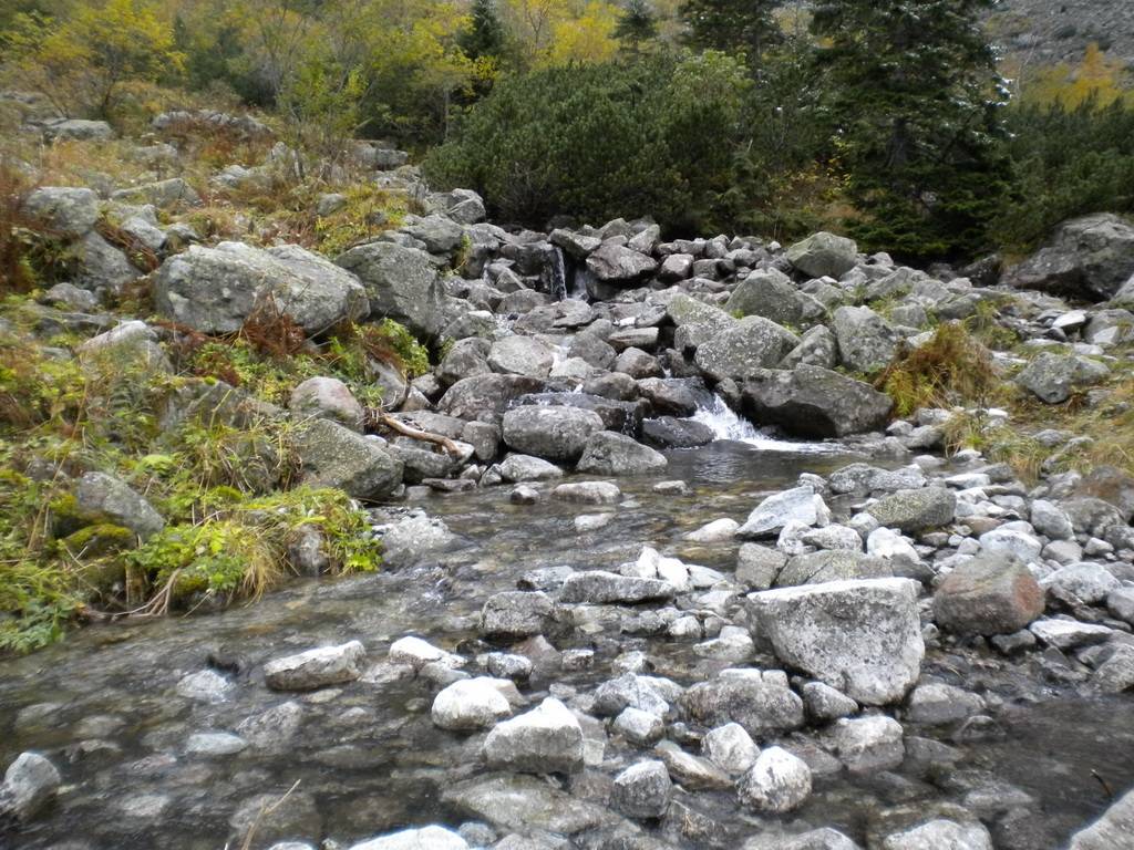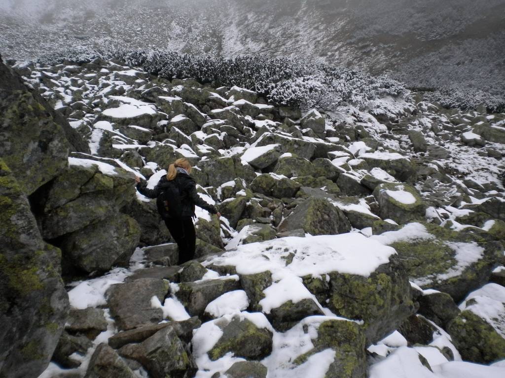 W październiku dni już nie są takie długie, a godzina była już późna. Dlatego zaczęliśmy się kierować z powrotem na dół. Obeszliśmy Czarny Staw i Morskie Oko z drugiej strony, po czym...zobaczyliśmy szlak, który prowadził przez Dolinę Pięciu Stawów. Eee to pikuś :) Zdążymy, raz dwa i wszystko obejdziemy. No więc w górę! Piękne widoki, bardziej dzikie, ścieżki mniej wydeptane, trudniejsze przejścia i ludzi praktycznie nie było. Idziemy, idziemy a żadnego stawu nie widać. Tylko coraz bardziej ciemno. Dotarliśmy na jakiś szczyt – skalisty, zimny, gdzie dalej iść ciężko stwierdzić, bo ścieżki nie widać, w ogóle coraz mniej cokolwiek widać. Zawrócić, to bez sensu, za daleko zaszliśmy. Idziemy więc dalej, na wprost. I w końcu jest kolejny staw, a nawet drugi. Zapewne piękne, jednak było już dość mroczno i coraz bardziej wszystko zaczęło przypominać czarną otchłań. Dlatego też postanowiliśmy zrezygnować z pozostałych stawów i Doliną Roztoki wrócić na dół. W zasadzie już prawie biegnąc, aby zdążyć przed nocą i zamknięciem parkingu, dotarliśmy na dół. Po drodze mijaliśmy już tylko jedną parę, która jednak wyglądała bardziej profesjonalnie pod względem ubioru od nas.