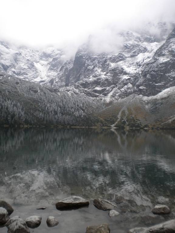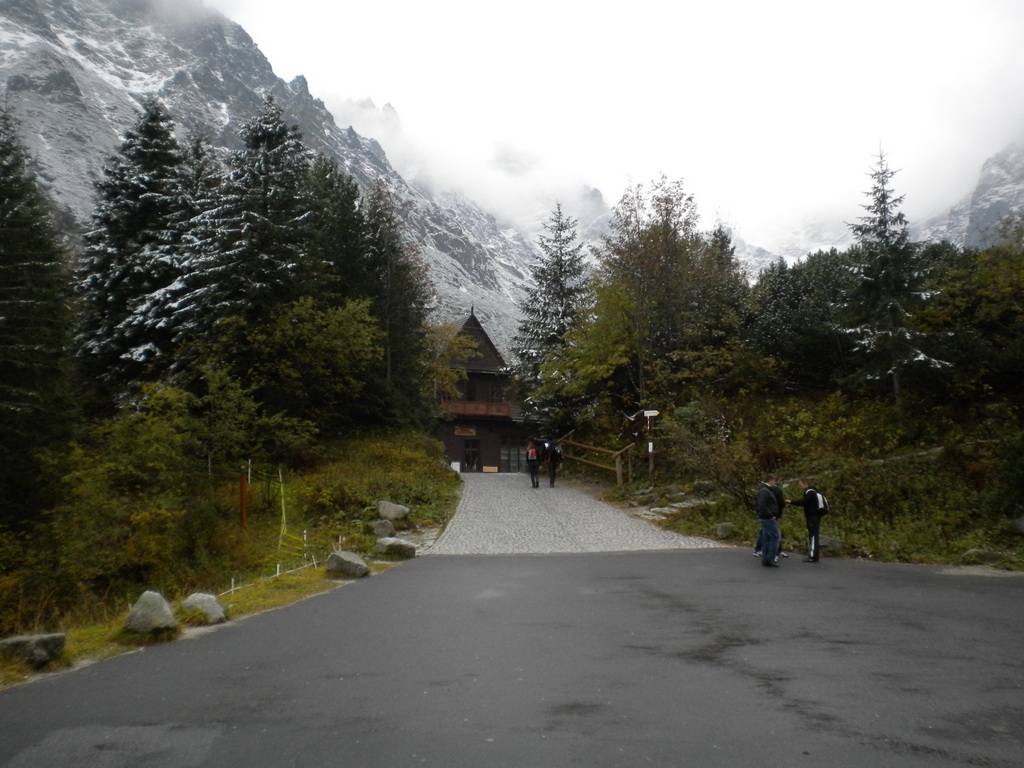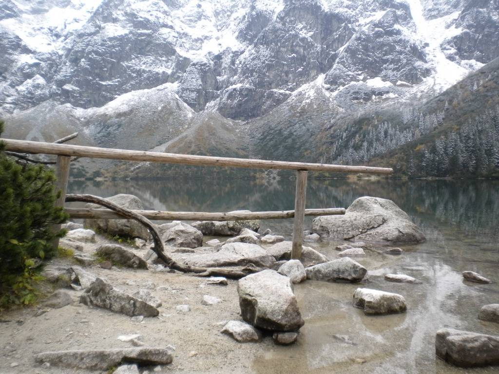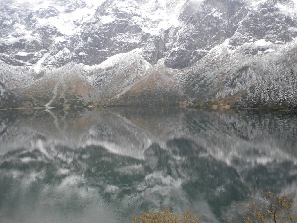 W pierwszy dzień udaliśmy się nad Morskie Oko. Jak wszyscy dojechaliśmy grzecznie na parking, zapłaciliśmy dudki (dużo dudków!) góralowi – parkingowemu, po czym żwawym krokiem ruszyliśmy asfaltem z całą masą ludzi pod górę. Szczerze mówiąc mało to było urokliwe – droga asfaltowa, na niej wręcz tłok, hałas. W zasadzie zależy od tego, co kto woli, ja jednak lubię kontemplować przyrodę w ciszy i spokoju. A tu – człowiek przystanie na chwilkę, aby coś zobaczyć, zamyślić się trochę, a tu już musi się przesuwać, bo inni chcą zdjęcia robić. No i ten asfalt! Ale widoczki naokoło były ładne, to trzeba przyznać – wodospady, źródełka, bujna roślinność. Tylko zwierząt nie było, pochowały się przed stadem jakie ciągnęło pod górę. Po ok 2 h dotarliśmy na szczyt. I tu muszę przyznać, zaparło mi dech w piersiach. Piękny widok Morskiego Oka – cały jego już surowy, lekko zimowy wyraz, cały majestat i piękno dzikiej przyrody zrobiły na mnie niesamowite wrażenie. Góry pięknie odbijały się w tafli stawu, tworząc cudowny pejzaż. Po dłuższej chwili napawania się tym wspaniałym krajobrazem wstąpiliśmy do legendarnego schroniska nad Morskim Okiem, aby napić się czegoś ciepłego. Schronisko nieduże, wręcz ciasne, jednak klimatyczne.