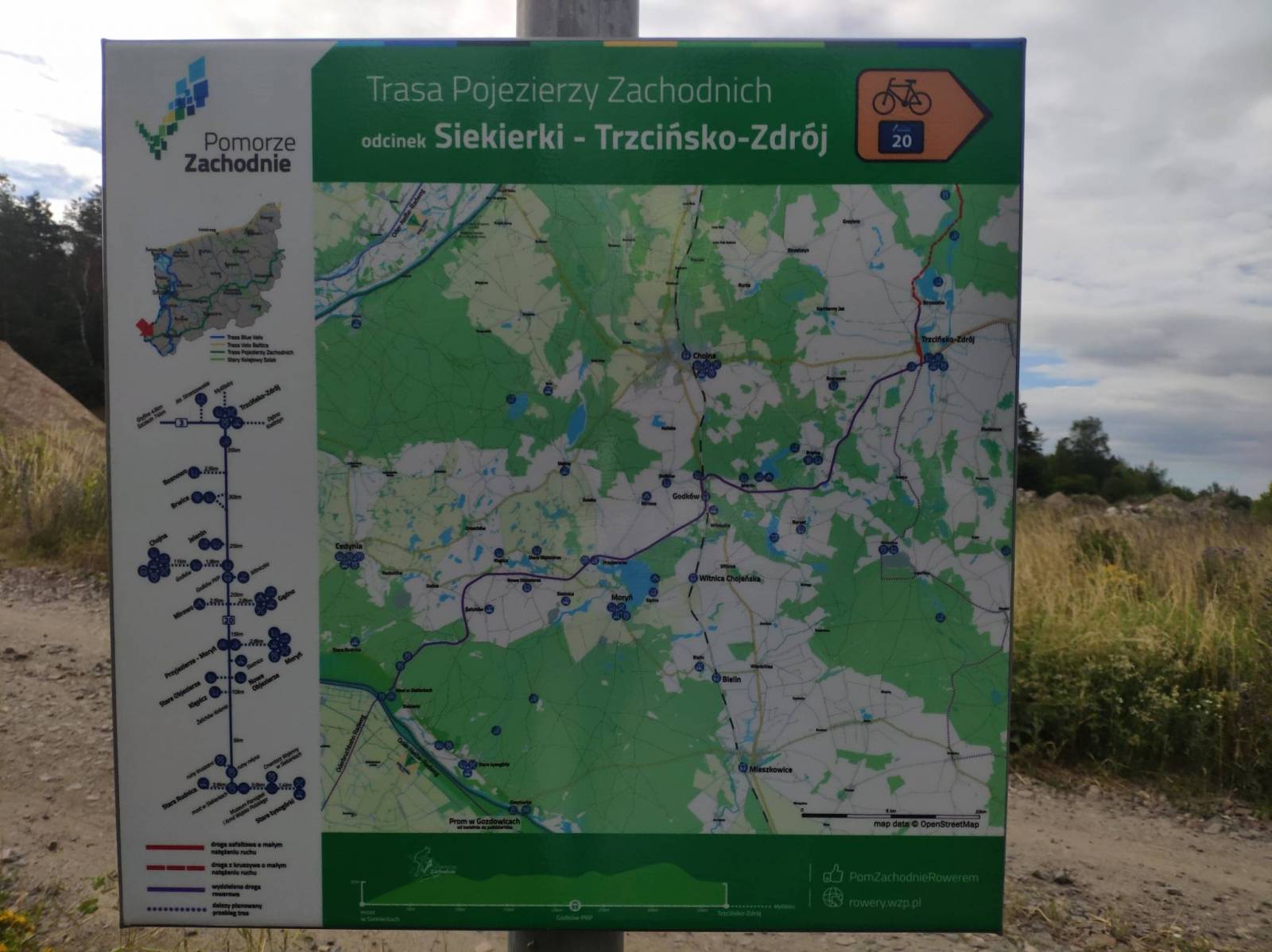 Trasa Velo 20 do Trzcińska, a potem przechodzi na Velo 3. Najgorsza droga jest do miejscowości Banie, (jest do bani). Oznakowanie spoko.