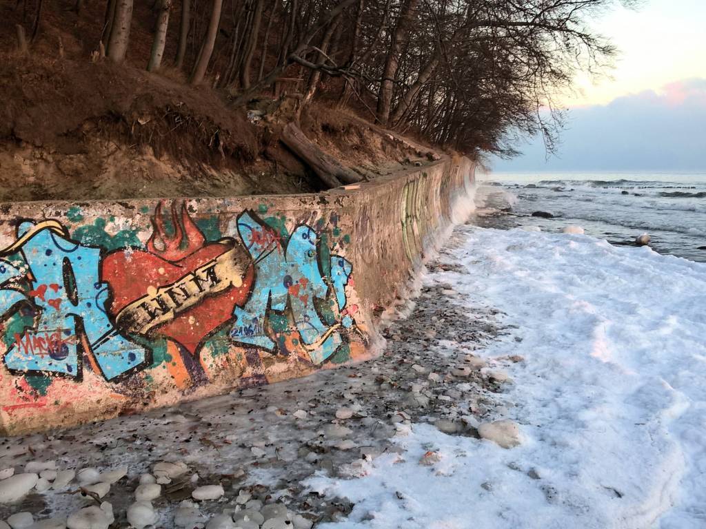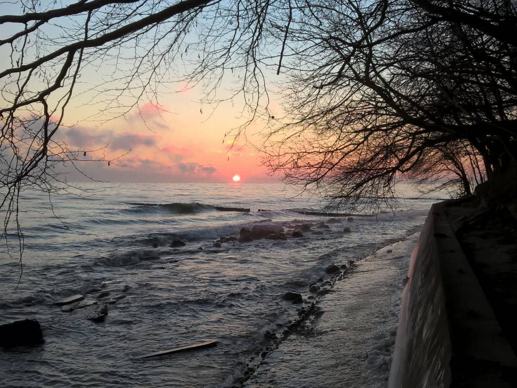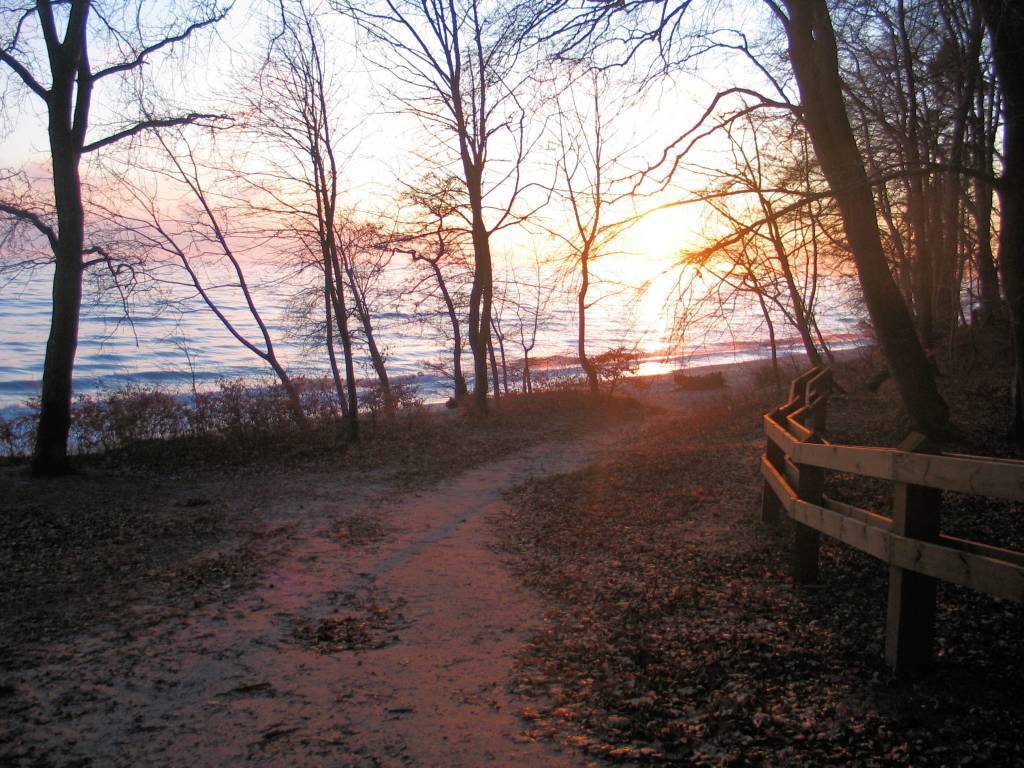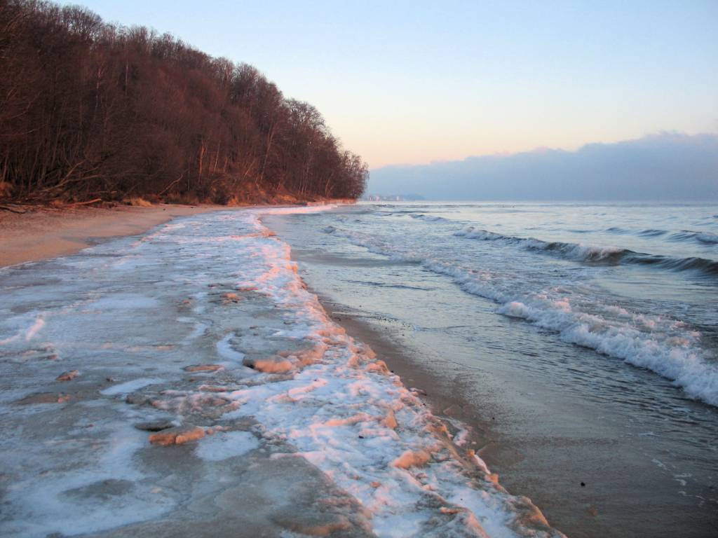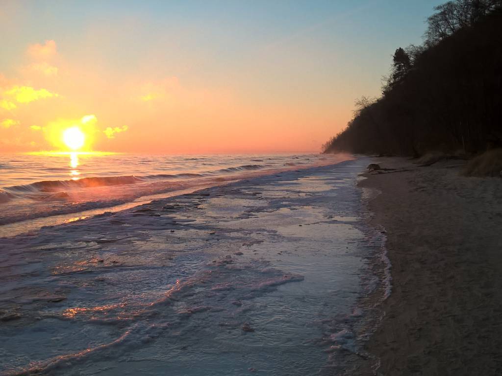 Mroźny poranek, trzynaście kresek na minusie i piękny wschód słońca nad brzegiem morza. Temperatura powietrza jest dziś dużo niższa od temperatury wody dlatego widać parujące morze. Trasa łatwa do pokonania, trochę wzniesień.