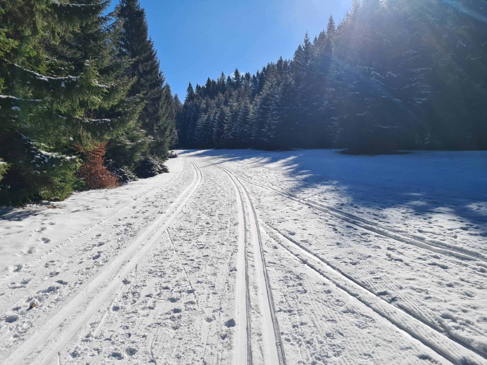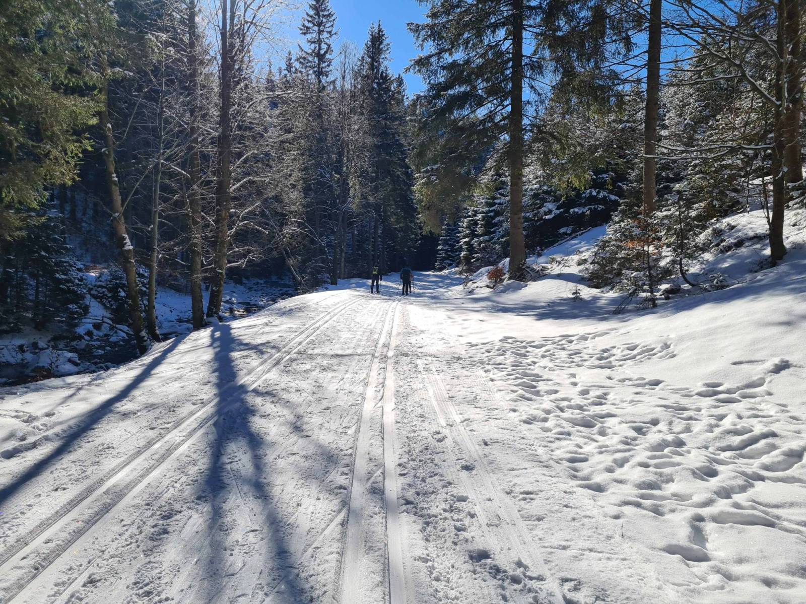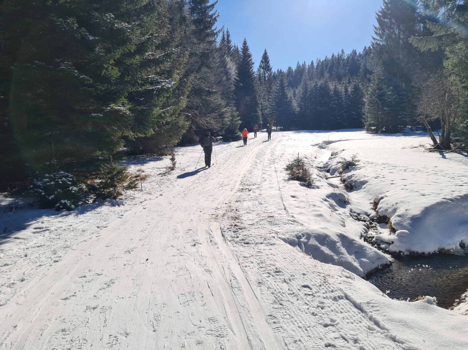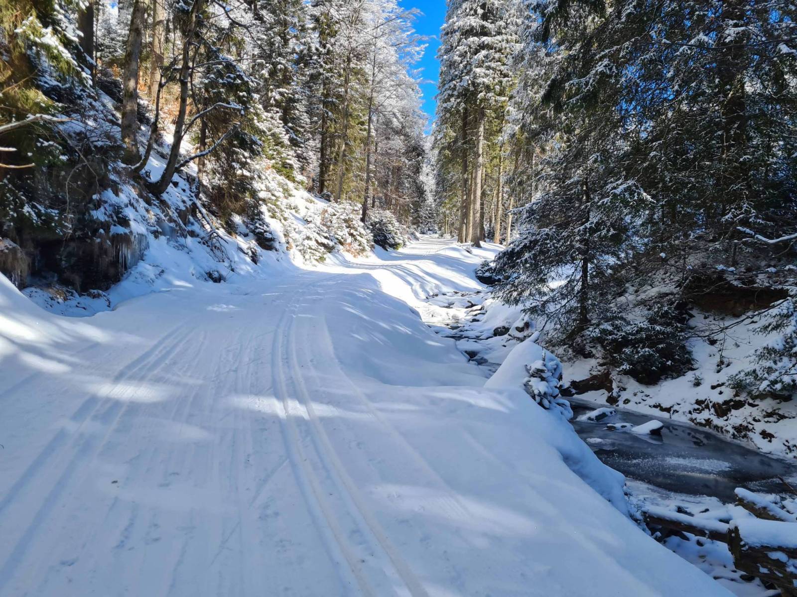 W nocy temperatura spadła do minus 14 , ale dzień zapowiadał się pięknie . Około godziny 11 pojawiam się na parkingu w Bielicach , stoi już kilka aut , ale tłoku nie ma. Ruszam wzdłuż Białej Lądeckiej , potem Białym Spławem i dalej na Bruska . Uwielbiam to miejsce . Przepiękne zimowe krajobrazy a i Brusek jest przecudny . Całkiem sporo także biegaczy . Wracam podobną trasą , tory dziś szybkie . Całkiem fajnie się biegało.