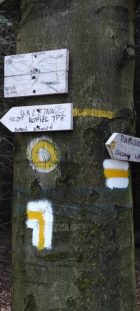 Tym razem wypad na Kudłacze z Myślenic. Trasa przyjemna z mniej wymagającymi podejściami. W trakcie zaliczona Uklejna 680mnpm, Śliwnik 619mnpm, Wierch Stróża 648mnpm oraz Chełm 614mnpm. Na podejście wybraliśmy szlak czerwony a dokładnie odcinek Małego Szlaku Beskidzkiego biegnący naszą trasą do Schroniska PTTK na Kudłaczach. Jak wiadomo MSB ciągnie się od Bielska-Białej-Straconki po Luboń Wielki na odcinku 137 km i pod względem długości jest czwartym szlakiem polskich Karpat. Na powrót obraliśmy dla urozmaicenia wycieczki szlak zielony przez Wierch Stróża i Chełm.