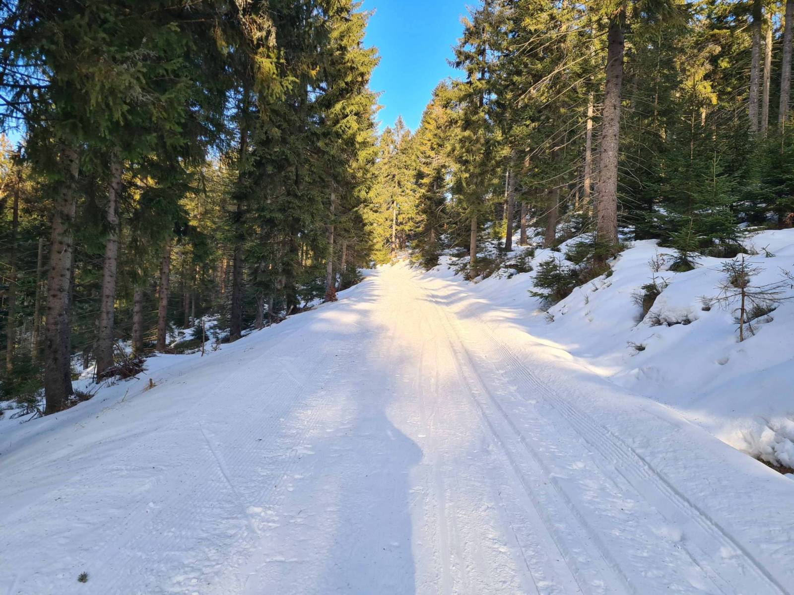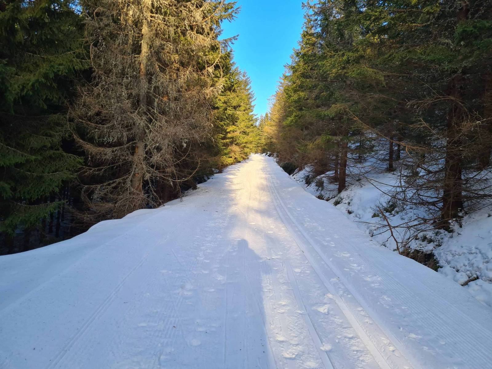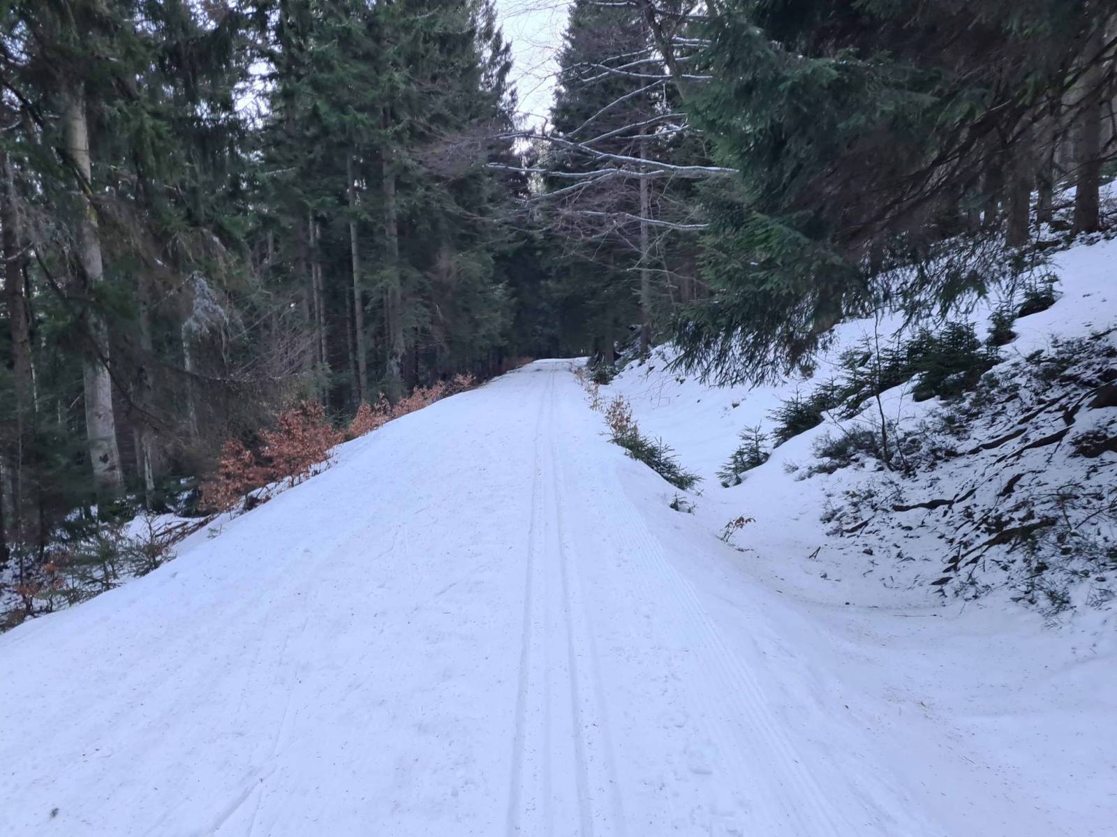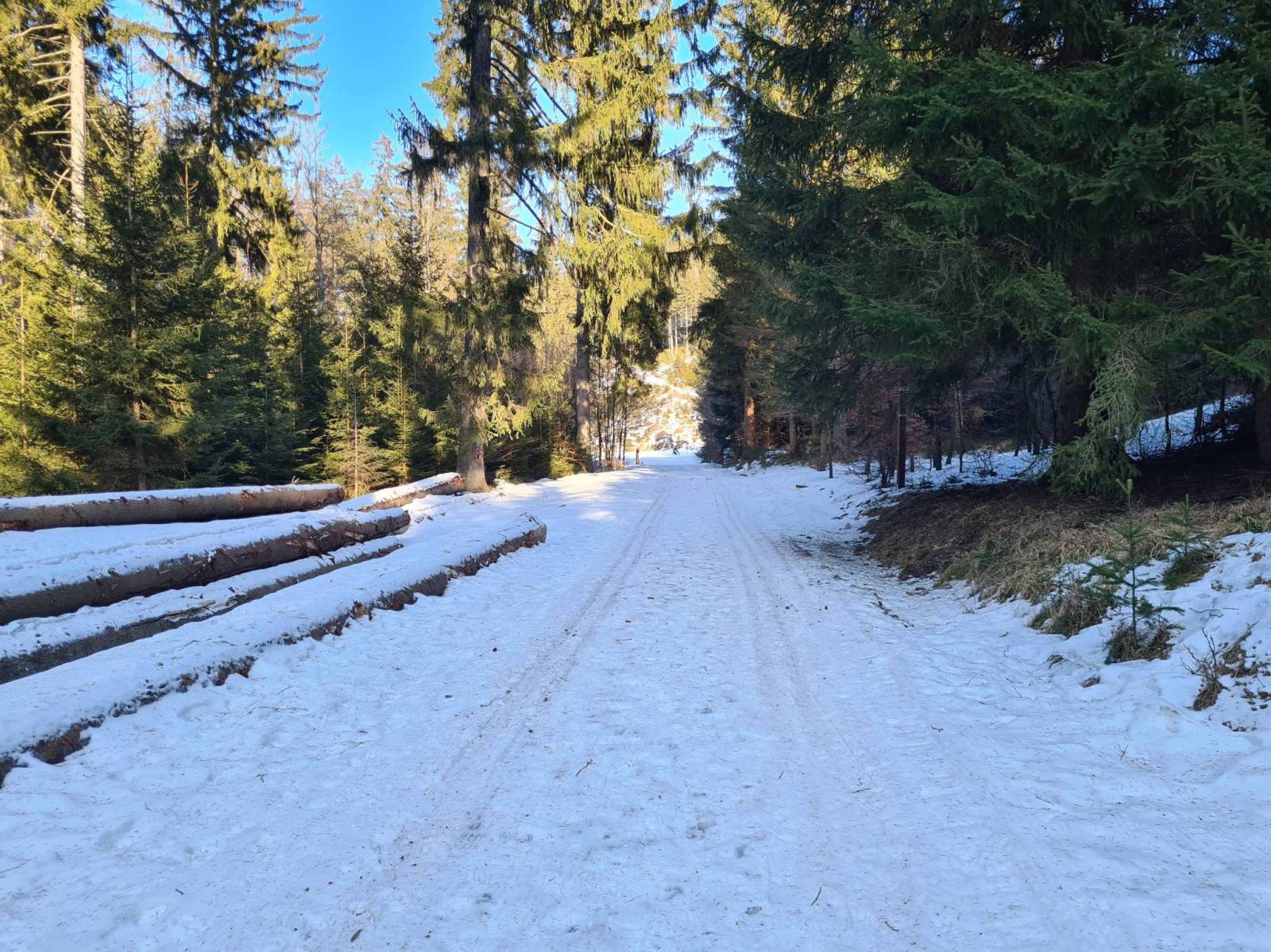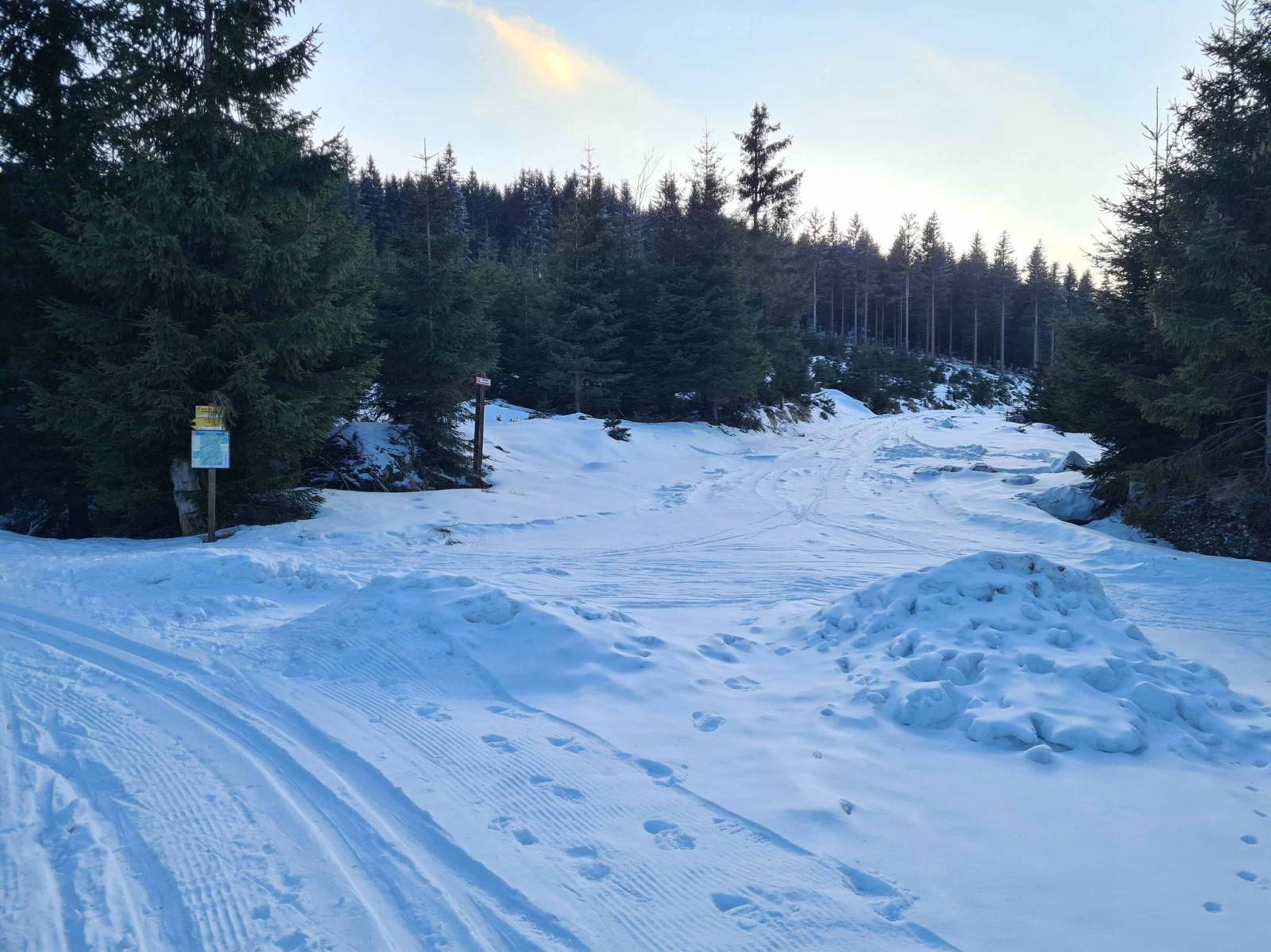 Dziś wyruszam z Nowej Morawy . Na mapach zaznaczono ,że jechał tam ratrak . Faktycznie jechał , tylko ,że śniegu mało i w dolnych partiach sporo kamieni i przetarć . Tłoku nie ma , ale na małym parkingu stoi kilka aut . Mijam osoby , które wracają z biegów , prawie wszyscy w dół poruszają się pieszo , to ze względu na stan trasy . Po drodze spotykam znajomych , trochę zawiedzeni warunkami , ale generalnie ma źle . Dobiegam do Wielkiego Rozdroża i wracam na parking . Zostały tu już tylko dwa auta.