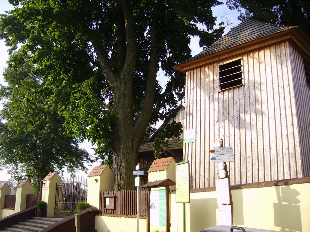 Po dotarciu do drogi asfaltowej nadal kierujemy się prosto na wschód, skręcając w prawo dopiero w miejscu, gdzie nie da się już iść prosto. Za skrzyżowaniem widać wspaniały zabytkowy, drewniany kościół św. Idziego zbudowany w 1789 roku. Warto zwrócić uwagę na towarzyszącą mu drewnianą dzwonnice. Kościoły drewniane nie należą do częstych widoków, stąd warto poświecić chwilę na jego dokładne obejrzenie. Jednakże plac na którym kościół się znajduje, jak i sam jego budynek może być zamknięty.