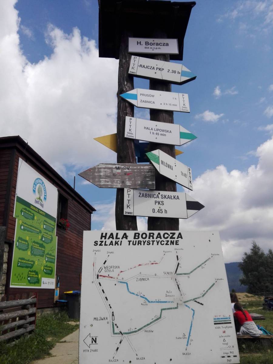 Tym razem wybraliśmy się w Beskid Żywiecki. Wybór padł na Żabnicę jako miejsce wypadowe oraz początek i koniec pętli. Znajduje się tutaj parking częściowo zacieniony z miejscami pod koronami drzew, jak również sklep spożywczy, w którym można uzupełnić zapasy i potwierdzić pieczątką przebieg wędrówki w swojej książeczce GOT i nie tylko. Niestety nie dociera tutaj żadna komunikacja publiczna, ale widnieje tabliczka z nr. telefonu transportu prywatnego. Z tego miejsca możemy się udać w kierunku: Hali Boraczej, Lipowskiej, Rysianki, jak również na Prusów, Abrahamów czy przez Boraczą do Rajczy. My obraliśmy kierunek na Halę Boraczą i tak zaczęliśmy podejście początkowo asfaltową drogą potem leśnym duktem za czarnymi znakami. Po około 3,5 km i 45 minutach byliśmy już na Hali Boraczej w schronisku czekając na świeże jagodzianki prosto z piekarnika, o których krążą już legendy. Po uzupełnieniu kalorii udaliśmy się zielonym szlakiem w kierunku Hali Redykalnej. Aby tam dojść, musimy po drodze odbić z zielonego w czarny. Na hali znajduje się punkt widokowy, gdzie warto zaplanować odpoczynek i pocieszyć oko panoramą Beskidów. Z H. Redykalnej podążamy za żółtymi znakami w kierunku Schroniska na Hali Lipowskiej, pokonując podejście na Halę Bacmańską i dalej do skrzyżowania Pod Lipowskim Wierchem. Tu skręcamy w prawo i równolegle z zielonym szlakiem drepczemy do Schroniska na Hali Lipowskiej. Przed schroniskiem przywitał nas pies pasterski, wylegując się przed wejściem. Tego schroniska nie trzeba specjalnie opisywać i reklamować. Tradycja rodzinna sięgająca końca lat 60. XX w. mówi sama za siebie, a gospodyni Pani Maria troszczy się o turystów do dziś wraz ze swoimi dziećmi i dorosłymi już wnukami. Miejsce godne polecenia. Po pysznej kwaśnicy i przeczekaniu przelotnego deszczu udajemy się do kolejnego wyjątkowego miejsca, czyli Schroniska na Hali Rysianka, które znajduje się nieopodal stąd, bo jakieś 15 min maszerowania leśną ścieżką. Tutaj na Rysiance widoki zapierają dech w piersi. Warto się dłużej zatrzymać podziwiając panoramę Karpat. Hala pod szczytem góry o tej samej nazwie oferuje widoki na Pilsko, Babią Górę, a przy dobrej pogodzie nawet na Tatry i słowacką Małą Fatrę. Schronisko, które się tu znajduje ma w swojej ofercie saunę, jak również stojącą obok chatę do wynajęcia. Niestety pora wracać...obraliśmy drogę powrotną zielonym szlakiem przez Halę Pawlusią do Żabnicy zataczając pętlę. Schodząc z Rysianki nie umknie nam widok na Romankę, którą zaliczymy innym razem. Trzeba dodać, iż ilość jagód w tych rejonach jest powalająca i co po chwilę nasze dzieci nurkowały w krzakach, objadając się nimi.
