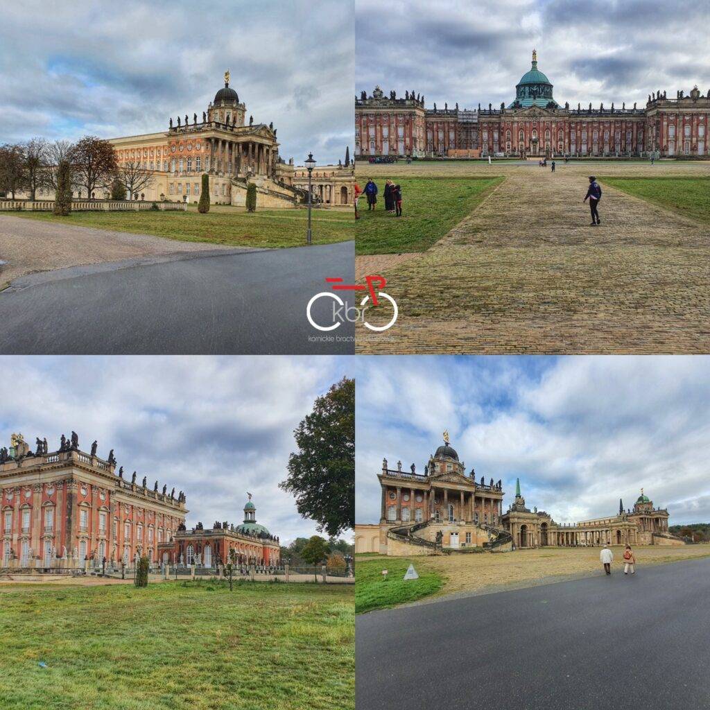 Pod „nowym pałacem” (a tak, tak, w Poczdamie majątek Sanssouci to dwa pałace, „stary i nowy”) spędzamy dłuższą chwilkę, tradycyjnie poświęcając ją na „focenie”, po czym nieśpiesznie udajemy się ku głównej atrakcji majątku Hohenzollernów. Od razu też zauważamy różnicę… przybywa turystów, pojawiają się zakazy jazdy na rowerze… słowem… główny punkt naszej wizyty w podberlińskim mieście zdecydowanie dziś nie chce być przez nas obejrzanym. Trochę więc zawiedzeni wracamy więc na trasę, z mocnym jednak postanowieniem, że trzeba tu będzie jeszcze wrócić. Bo o ile poruszanie się po Poczdamie na rowerze jest zdecydowanie warte polecenia, to już zwiedzanie majątku Sanssouci niespecjalnie z tym rowerem konweniuje. Tzn… jeśli jedzie się bez sakw, na lekko i można rower bez bagażu pozostawić przypięty w licznych przeznaczonych do tego miejscach… to nie ma problemu. Ale nasze osakwione pojazdy zostawiać tak same, na łaskę i niełaskę rodzaju ludzkiego. No wolimy jednak nie…
