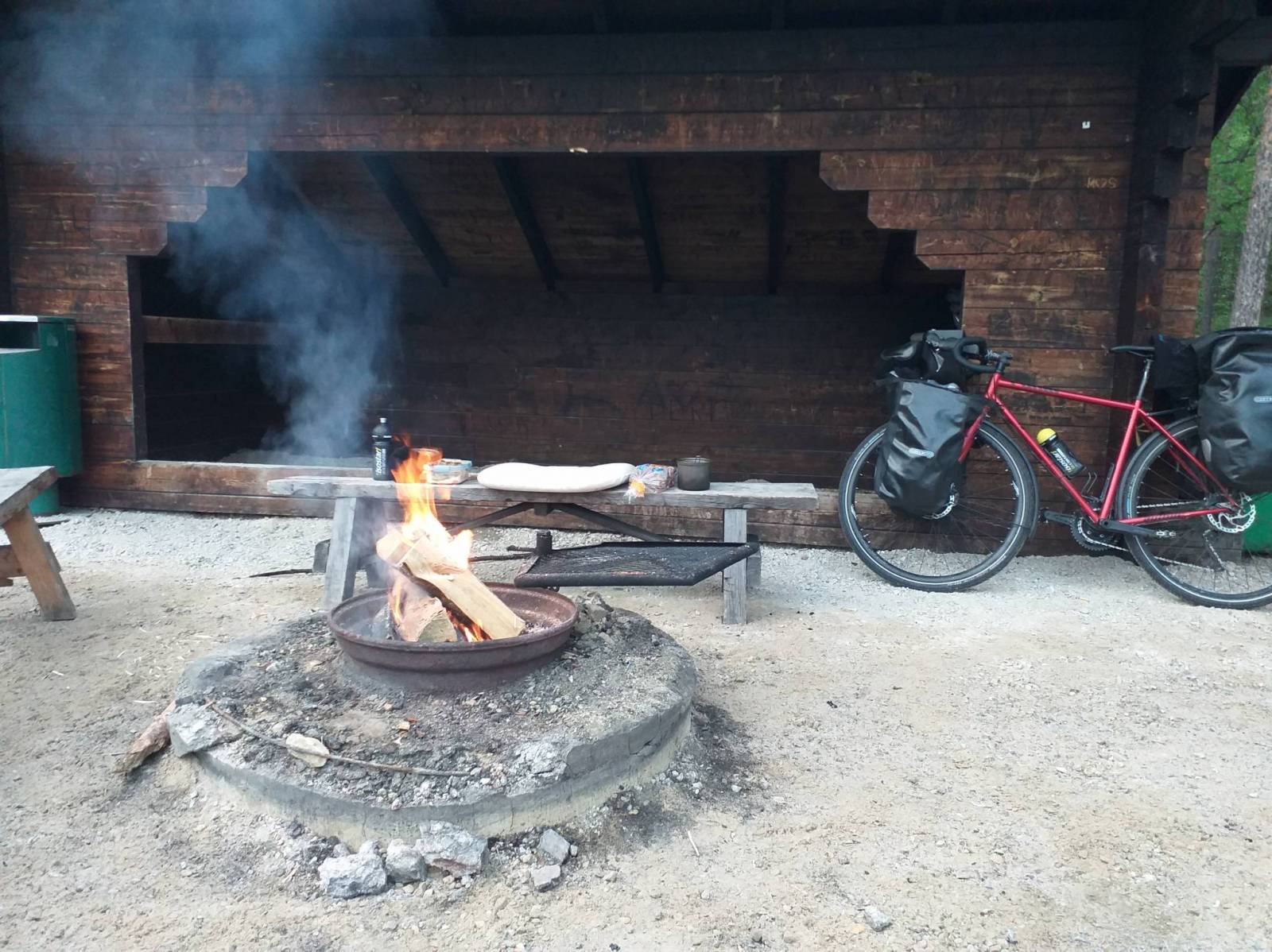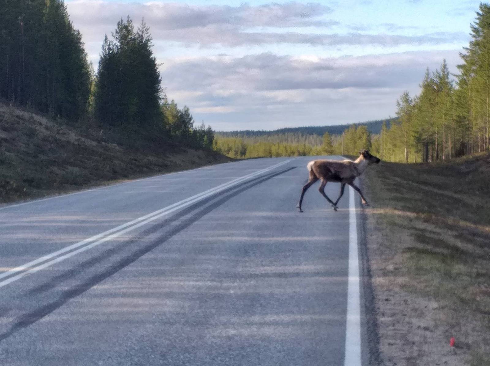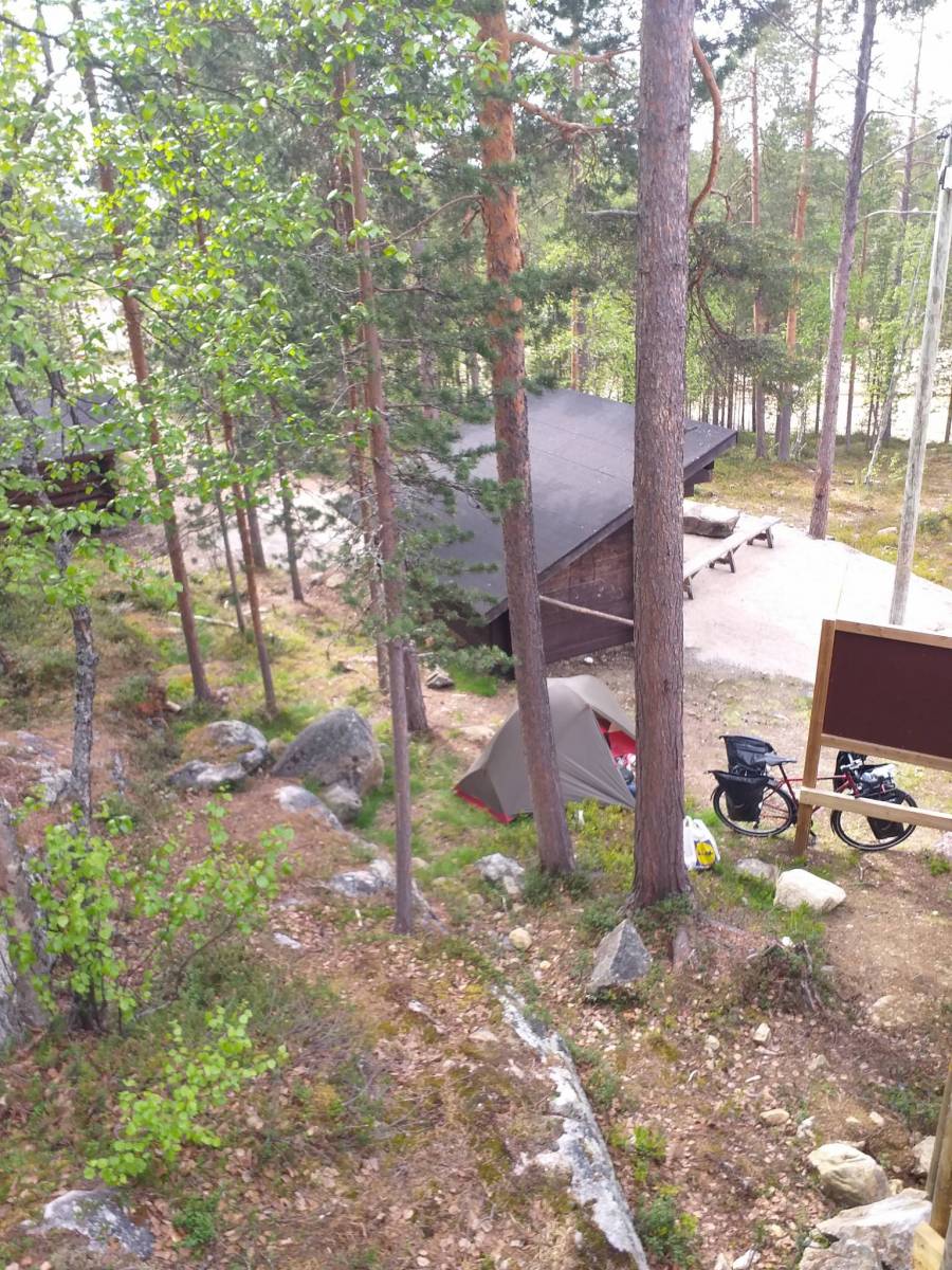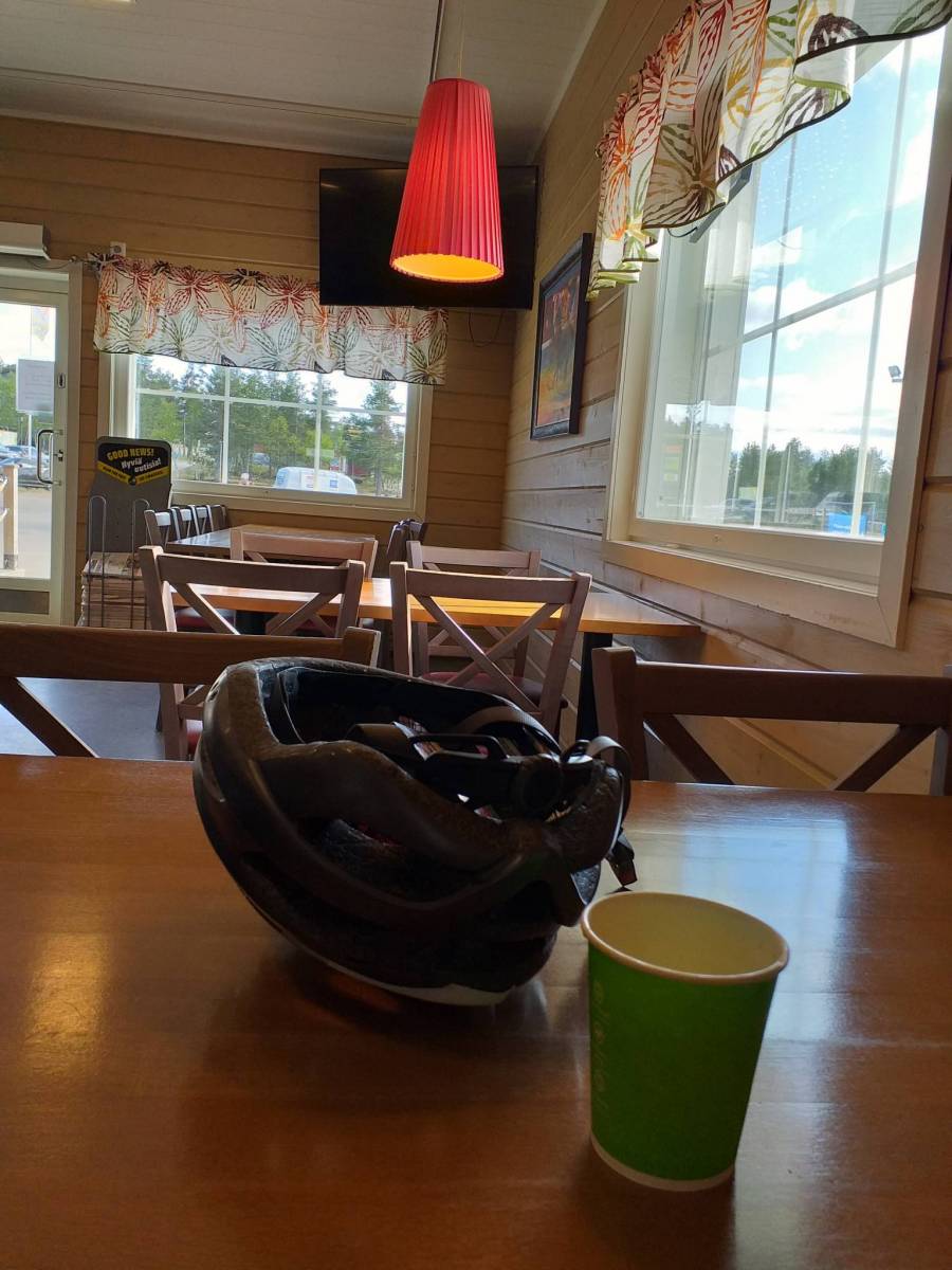 W Saariselka zatrzymałem się na kawę oraz musiałem naładować powerbank. Spotkałem tam Fina na rowerze, który wracał z Nordkapp. Mówi, że śniegu już nie ma, ale jest chłodno. Dziś w tym miejscu jest chłodno. Nie pada deszcz, ale wieje ostry, zimny wiatr.