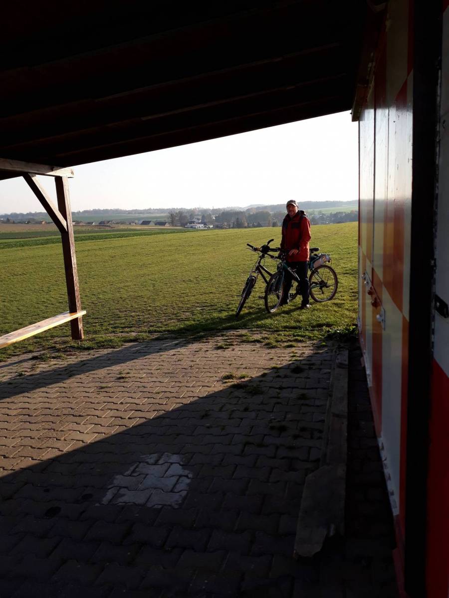 I znowu popołudniowa wycieczka. Tym razem prowadzi przez Meandry Odry przez Rudyszwałd do Hať przez lotnisko sportowe takie malutkie w Hať, znowu koło wiatraków no i przez Daŕenec. Tym razem jednak na rozwidleniu w lesie pojechaliśmy na prawo. Są znaki także nie idzie przegapić. Jednak ta droga jest drogą szrotową i prowadzi kawałek pod górkę przez pole aż wyjeżdża się na drogę rowerową. Nie jest to asfalt tylko taki drobny grys. Jest ostro z górki więc trzeba ostrożnie zjeżdżać z tej nawierzchni. Przepiekne widoki i krajobraz. Wjeżdżamy do Pišč a potem na Owsiszcze już w Polsce. Tam trochę zabawilismy oglądając domek ale wracamy na główną drogę i ciągniemy ostro pod górkę do Nowej Wioski. Wyjątkowo piękna miejscowość dzięki niezwykle pomysłowym mieszkańcom. Ich obejścia są bardzo ładne a niejedno bardzo oryginalnie ozdobione co czyni przejażdżkę jeszcze bardziej atrakcyjną. Potem zjeżdżamy na drogę rowerową w Krzyżanowicach kierunek Roszków. Tutaj nic ciekawego. Droga fajna ale kończy się w Roszkowie. Dzisiaj co prawda święto było ale ruch jak w zwykły dzień, czyli dla rowerzysty nie za fajnie. Ale w krótce skręcamy na Nowy Dwór i tu już blisko do Zajazdu przy kominku. Zjedliśmy ciepły posiłek w miłej atmosferze.Latem są tam bardzo dobre włoskie lody. To tak na marginesie wspominam???? Rozgrzalismy się trochę i do domku. Już tylko 2km i byliśmy na miejscu.