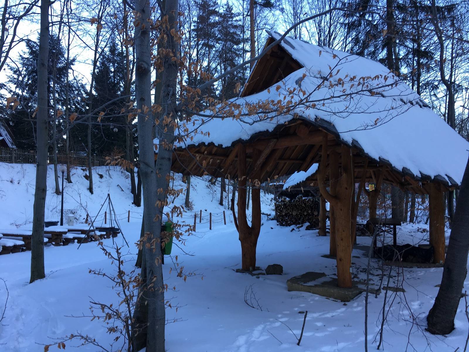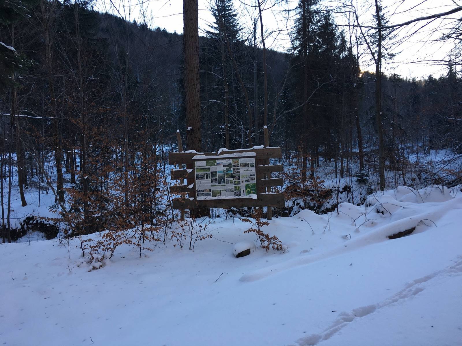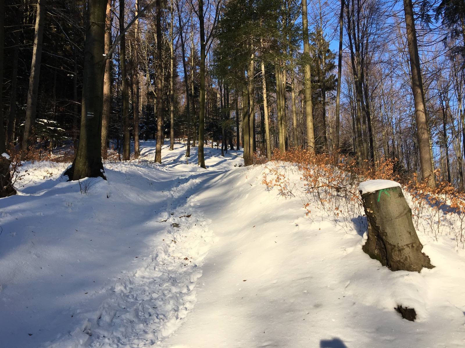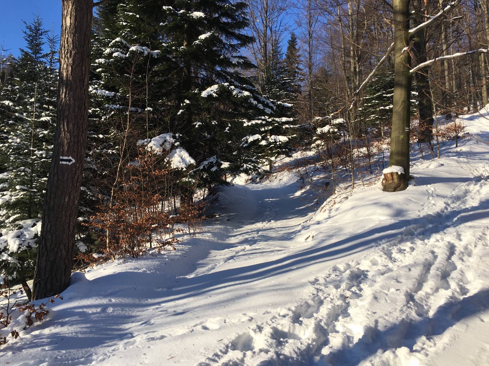 Do osiedla Praciaki w Rzykach dojechałem od strony Andrychowa i zostawiłem auto na parkingu przy hotelu Czarny Groń.Trasa biegła od hotelu na Potrójną czarnym szlakiem. Droga po której prowadzi czarny szlak nieznacznie odbiega od jej lokalizacji na mapie turystycznej, którą kupiłem w aplikacji Traseo, ale po kilku zakrętach łączy się z przebiegiem mapowym. Następnie z węzła szlaków na Potrójnej czerwonym w kierunku Łamanej Skały. Zakończyłem zjazdem nartostradami ośrodka Czarny Groń. Pierwotnie plan był taki żeby dalej czerwonym szlakiem dojść do Łamanej Skały (Madohory), następnie skręcić na żółty i wzdłuż potoku Wieprzówka dojechać do dolnej stacji ośrodka Czarny Groń. Zmieniłem plany ze względu na to że na dole wystaje dużo kamieni i zjazd szlakiem byłby bardzo niebezpieczny dla nart. Od dolnej stacji do parkingu gdzie można dojechać prywatnym autem (pod dolną stację narciarze są dowożeni darmowym skibusem- około 1,0 km) próbowałem jeszcze gdzieś w lesie przy drodze zjeżdżać ale potem dałem za wygraną i resztę drogi przebyłem już z nartami na plecach. Trasa łatwa i piękna widokowo. Babia Pilsko Tatry i wiele innych grup górskich widoczne elegancko.