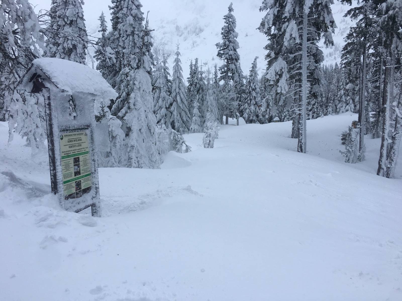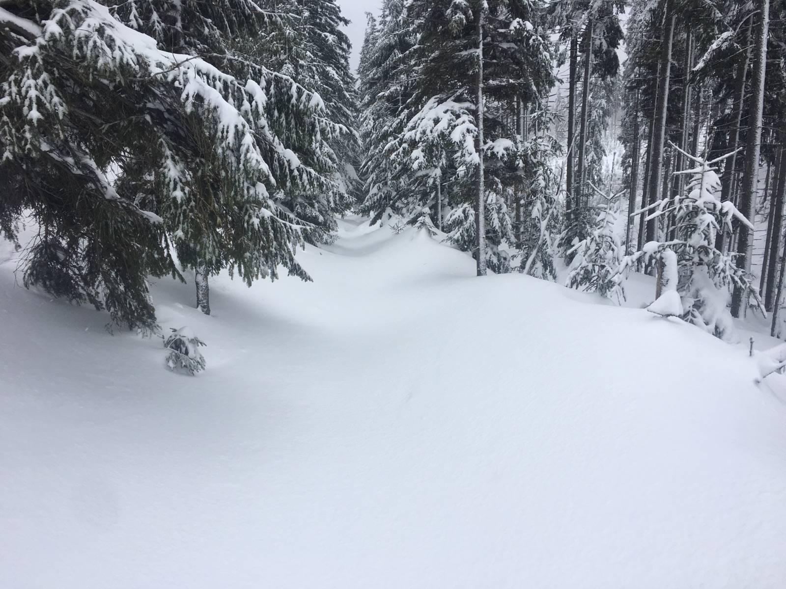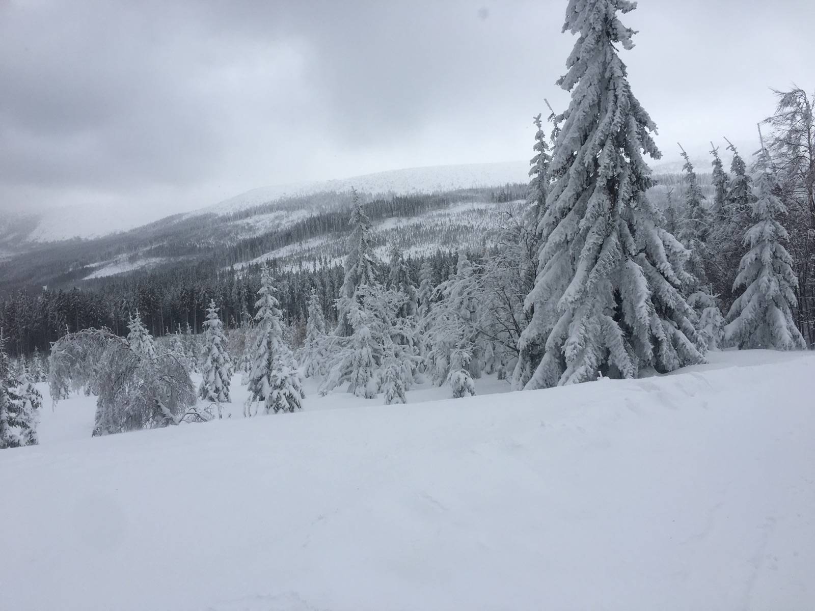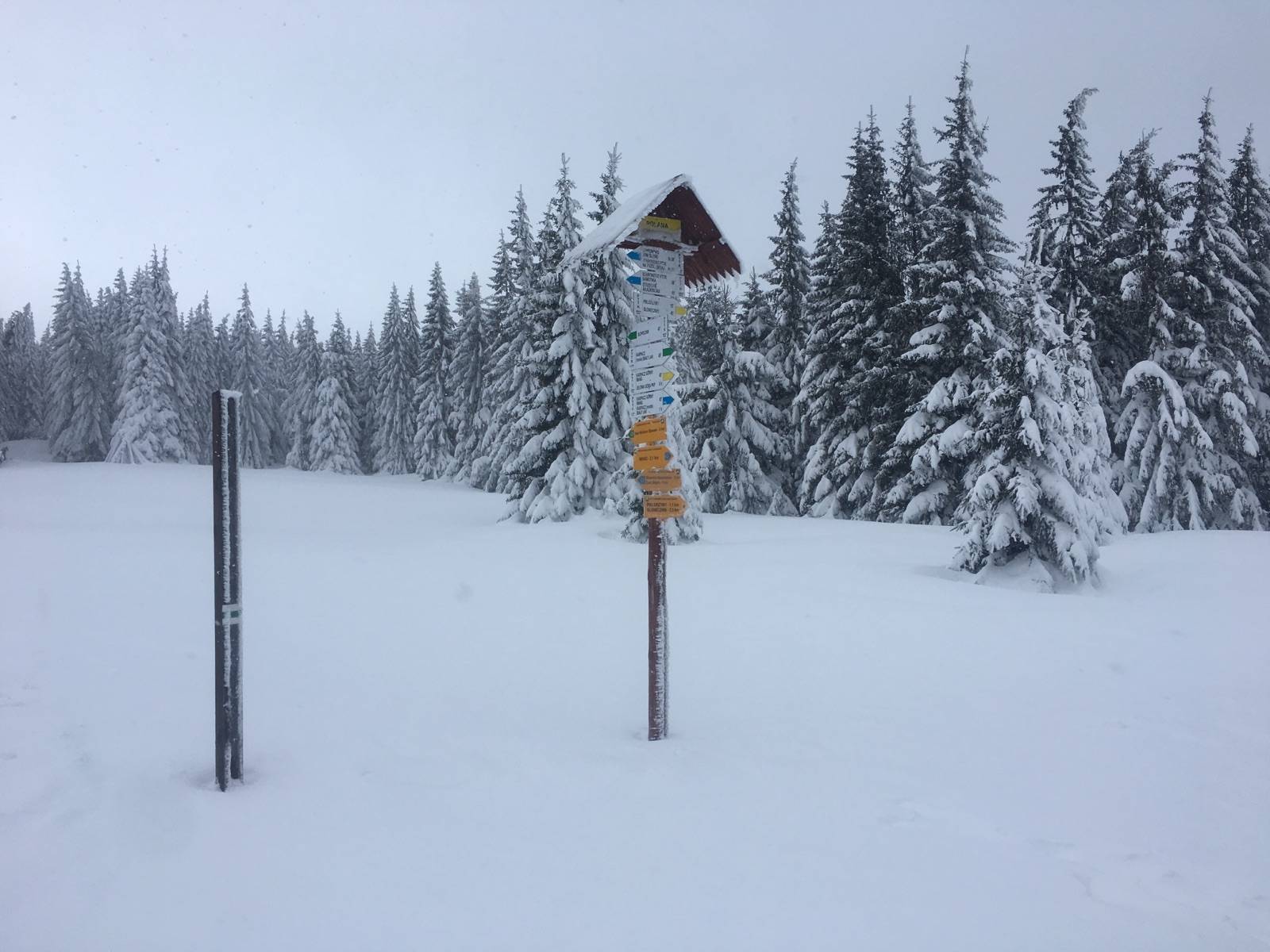 Powrót po noclegu w Samotni. Rano okropny wygwizdów ale po wejściu do lasu sytuacja bardzo się poprawiła. Trasa na zdecydowanej większości przetarta jedynie krótki odcinek zielonego szlaku z Polany zawiany tak że trzeba było przecierać.