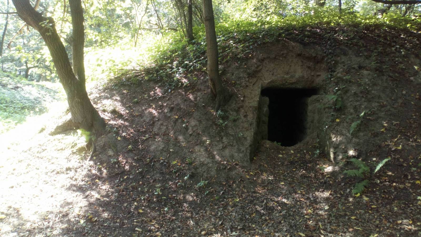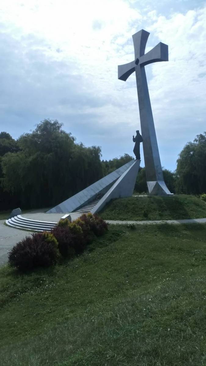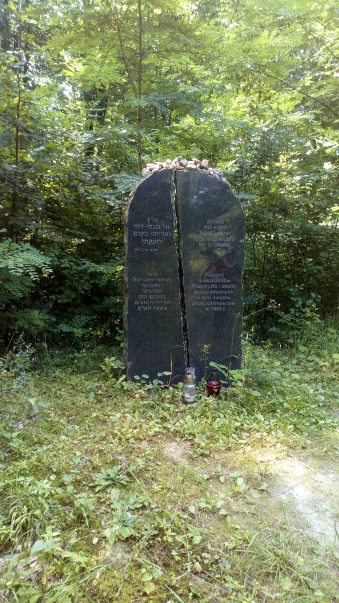 Po odpoczynku przeszliśmy koło kościoła kierując się w stronę mostu na Sanie, lecz przed nim skręciliśmy w prawo. Minęliśmy pomnik pomordowanych w czasie II wojny światowej i za zamkniętą knajpą weszliśmy na ścieżkę przyrodniczą. Znakowana była kiepsko... Wejście znajdowało się tuz przy ogrodzeniu knajpy, a sama ścieżka była wąska i kiepsko widoczna. Wspinała się lekko na wzgórze i szła jego zboczem. Później było już trochę lepiej. Szliśmy lasem, może przez jakiś kilometr. następnie ścieżka prowadziła na dół i dalej szeroką drogą przy szkółce leśnej. Kolejny etap prowadziła wzdłuż ściany lasu. W las weszliśmy przy widocznych ruinach domu, którego mieszkańcy zamordowali Niemcy w czasie II wojny światowej. Wróciliśmy się jeszcze z ego miejsca do pamiątkowego kamienia nieopodal i tam odpoczęliśmy. Potem dalsza wędrówka ścieżką przyrodniczą... Znakowana była nadal słabo, na wielu rozwidleniach trzeba było się naprawdę zastanawiać którędy iść, ale finalnie zawsze trafiało się dobrze. od miejsca z masztami - garbów, zeszliśmy dla odmiany szlakiem, aby nie powielać trasy z momentu dojścia do Krasiczyna od schronu.