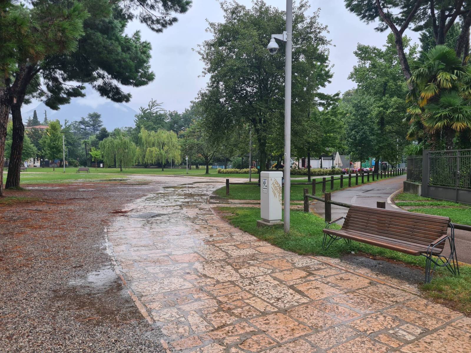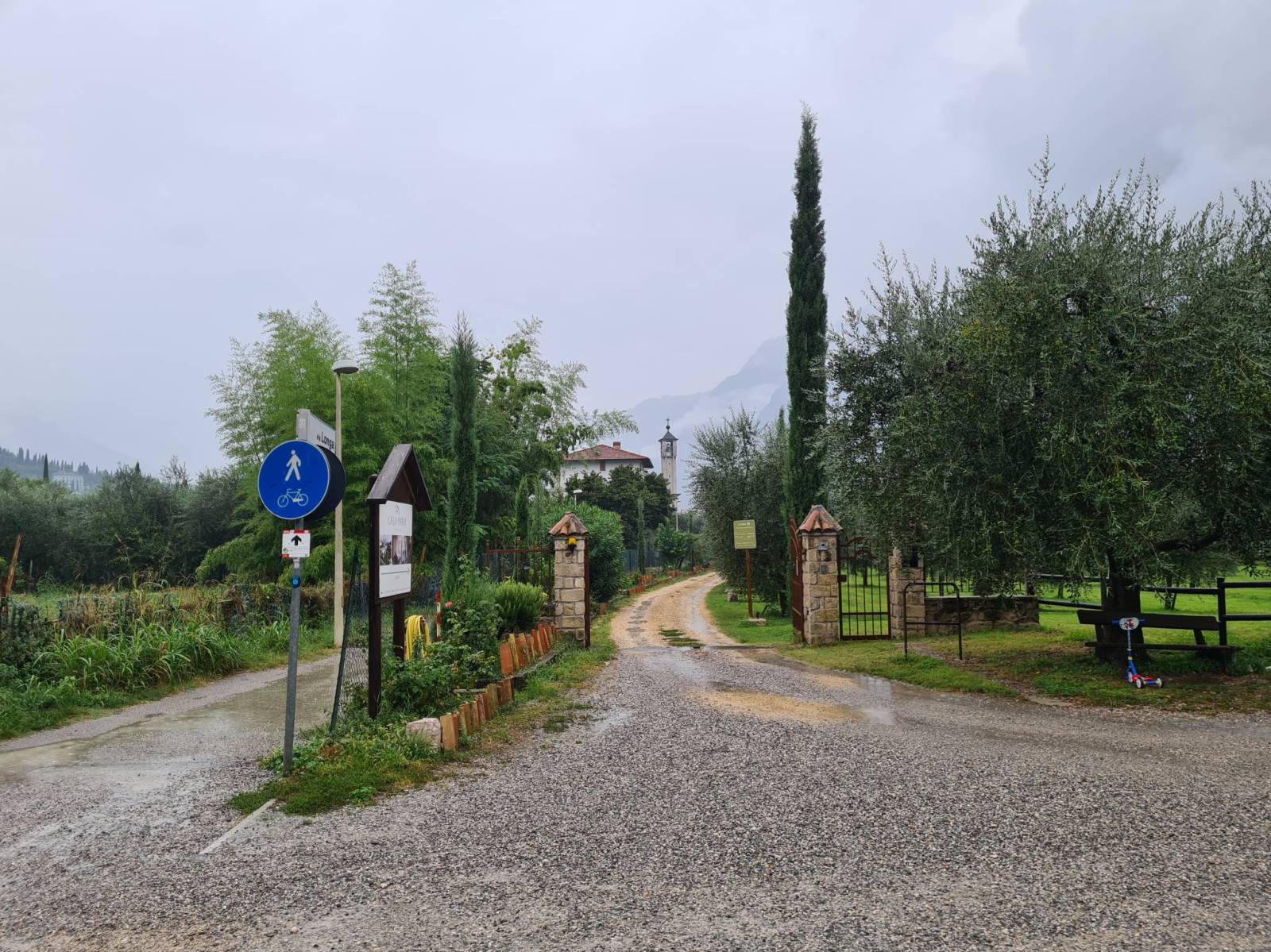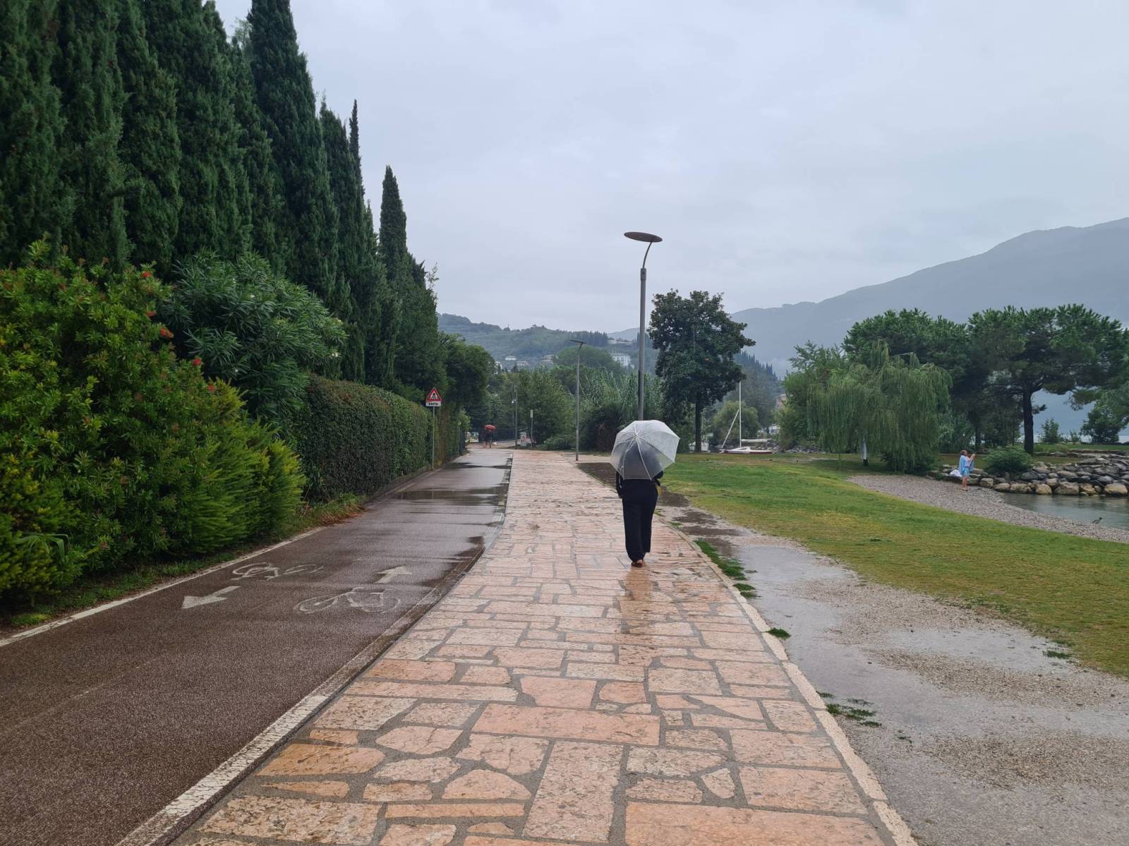 Riva del Garda przywitała deszczem . Temperatura całkiem przyjemna , ale jazda rowerem raczej nie bardzo . Po długiej trasie samochodem krótki wypad na miasto . Gelato i napoje .