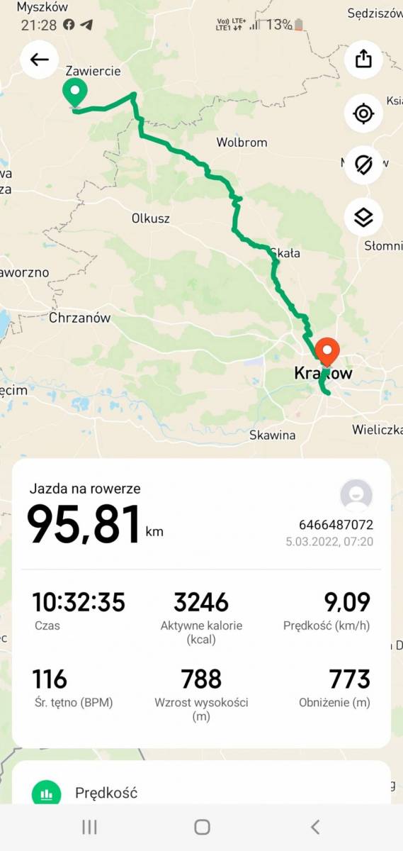 W Marcu 2022r postanowiliśmy się wraz z kolegą wybrać do Krakowa, wyjechaliśmy o 6:00 trasą przez Ojcowski Park Narodowy. Trasa była wymagająca dużo podjazdów, łącznie wyszło 95km jak pokazywało na zegarku. Na miejsce na Wawel dotarliśmy około godziny 16:00/16:30
