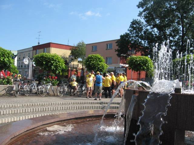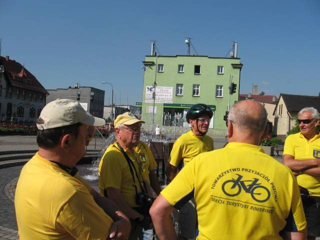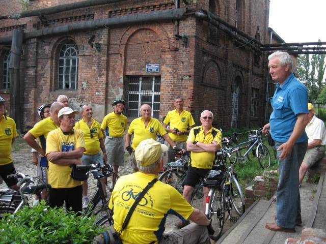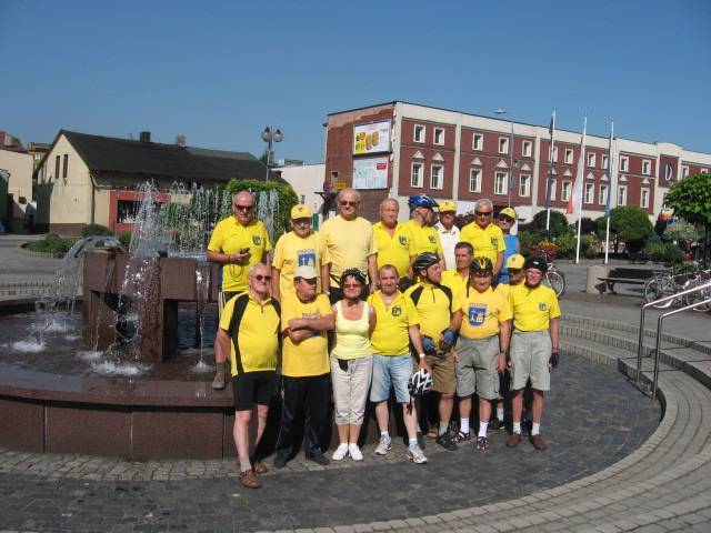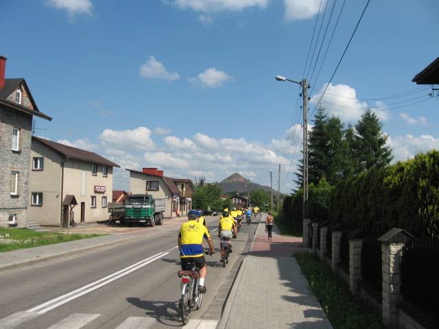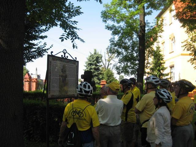 Po okresie złej pogody nareszcie zaświeciło słońce i mogliśmy zrealizować długo odkładaną wycieczkę na"Hoym".Tym razem trasa nie była najdłuższa ale planowaliśmy dużo atrakcji po drodze.Spotkanie zorganizowaliśmy na rynku w Rydułtowach o godz.9.00.Już w trakcie dojazdu na miejsce zadzwoniła córka czy wszyscy rowerzyści w żółtych koszulkach, których spotkała na trasie Pszów-Rydułtowy to nasza "czelodka". Frekwencja rzeczywiście okazała się rekordowa (było nas 19) ,co stwarzało pewne niebezpieczeństwo na trasie (zbyt długi peleton). Po tradycyjnym powitaniu przez Prezesa i przedstawieniu trasy przez Komandora ruszyliśmy na szlak. Pierwszy przystanek był już przy kościele św. Jerzego w Rydułtowach, gdzie znajduje się krzyż pokutny o podwójnych ramionach (jedyny w Polsce i jeden z 6 takich w Europie). Na stojącej obok tablicy opisano cel stawiania tych krzyży i związane z tym konsekwencje. Pózniej przez Głożyny pojechaliśmy do Niewiadomia gdzie czekał na nas p.Szwachuła, który przedstawił nam historię kop. "Hoym" i pokazał parową maszynę wyciągową (która do niedawna jeszcze pracowała). Zwiedziliśmy również wieżę wodną wybudowaną w 1953r. na trzonie dawnego komina,przebudowaną w 2007r. na wieżę widokową, skąd rozciąga się wspaniały widok na całą okolicę i Beskidy a przy dobrej pogodzie nawet widać Tatry. Po tych wrażeniach Prezes "zafundował" nam historyka amatora p.Adamczyka, który jest chodzącą kopalnią wiedzy o "grubach' i szybach na tym terenie oraz autorem książek o tej tematyce. Po tych wrażeniach pojechaliśmy do Izby Pamięci KWK "Rydułtowy-Anna" (po trasie zobaczyliśmy krzyż pokutny na ul. Radoszowskiej). Na koniec Prezes zarządził konkurs i szukaliśmy byłego szybu"Ignacy" kop."Anna". Nagroda była cenna (2 butelki piwa) które wygrał Antek G. Do Prezesa (gdzie było zakończenie) z "Ignaca" nie jest daleko więc wszyscy ruszyli sprintem żeby wreszcie napić się piwa. Pani Marysia jak zwykle przygotowała królewską ucztę więc fedrowaliśmy na całego. Żal było się rozstać ,ale niektórzy mieli parę kilometrów do domu i dziękując gościnnym Gospodarzom zakończyliśmy udane spotkanie.