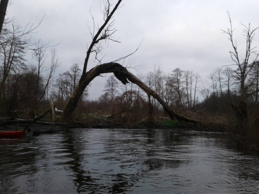 Co ciekawe rzeka jest o wiele trudniejsza od Rawki, nawet tej blisko źródeł, tym bardziej, że Rawka w górnym biegu jest na pewnym odcinku rzeką uregulowaną. Tutaj mamy do czynienia z rzeką naturalną w swoim korycie i jednocześnie uciążliwą przez dziesiątki wszelkiej maści kładek i zwałek. Dlaczego więc Rawka jest kultową rzeką zwałkową, opływaną na różne sposoby przez setki kajakarzy? A no dlatego, że Rawka wodę niesie cały rok, jest Rezerwatem Przyrody i przez to nieco bardziej jest pielęgnowana i zadbana z rozwiniętymi nad nią silnie ośrodkami turystyki kajakowej. Jest rzeką większą, przez co stwarza warunki do pływania w większych grupach, nawet rodzin z dziećmi. 10 grudnia skorzystaliśmy z wysokiej wody planując na cito odcinek Żelazna - Skierniewice (ok. 20 km), pogoda względna, 0 stopni z odczuwalnością na plusie, lekki śnieżek i wiatr, przebijające się czasami z za chmur słońce. Przepłynęliśmy 14 km do Strobowa w 5,5 godziny z krótkim odpoczynkiem na herbatę, kanapkę i ognisko. Rzekłem wtedy do Marzenny Congress & Spa, dzięki. Rzeka warta polecenia,