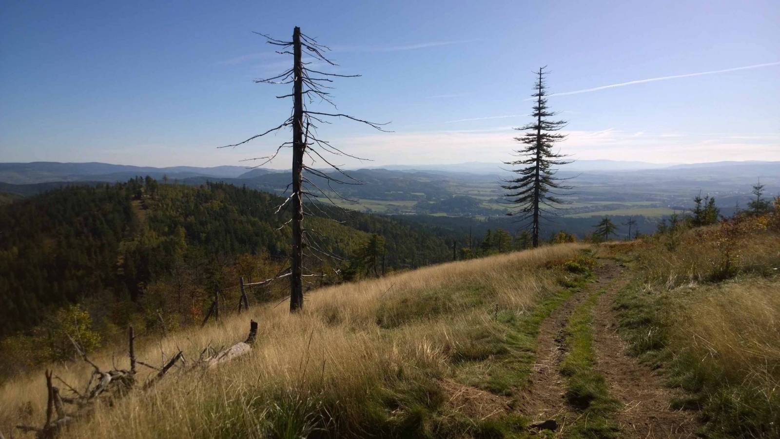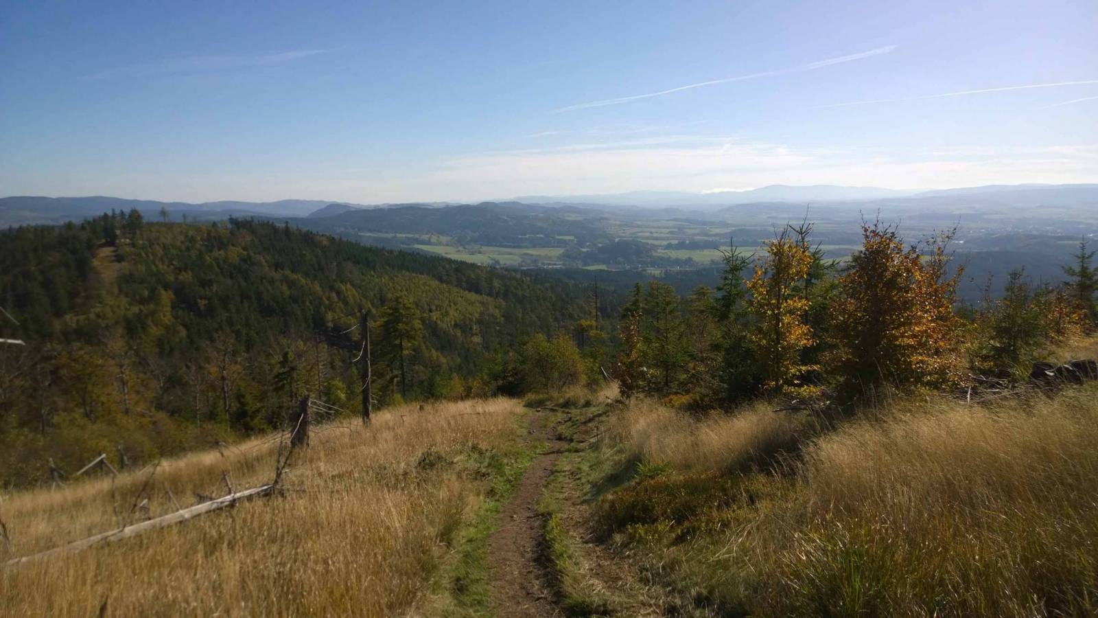 To miała być krótka trasa , w zasadzie tylko Ruprechticki spicak i powrót do schroniska Andrzejówka . Przy okazji maiłem sobie wypróbować jak się z kijkami po górach chodzi . Już jakiś czas temu zakupiłem trekingowe kije Black Diamond , ale nie było jakoś okazji . Dziś piękna pogoda , sobota , więc ludzi całe tłumy . Dodatkowo jakieś zawody . Droga na Ruprechticki niezbyt trudna , dopiero potem podejście pod szczyt może stanowić wyzwanie . Na szczycie przecudnie , z jednej strony widać Ślężę, z drugiej Śnieżkę . I te wyschnięte częściowo trawy falujące na wietrze . Można tam trwać i nic nie trzeba robić . Ale przychodzi czas na powrót . Na rozdrożu nagła decyzja o zmianie trasy i ląduje w Sokołowsku . Nie chciałem się tu znaleźć , no cóż trzeba coś wymyślić . Jest jeszcze dość wcześnie , przede mną szlak na Włostową , Kostrzynę .....dam radę . Pamiętałem podejście na Wlostową , trudne , strome , kamieniste . Przerobiłem to kilka lat temu . Kijki bardzo się tu przydały , potem było lżej , nie żeby lajtowo . Ale widoki i prawie całkowity brak turystów . Warto było :)