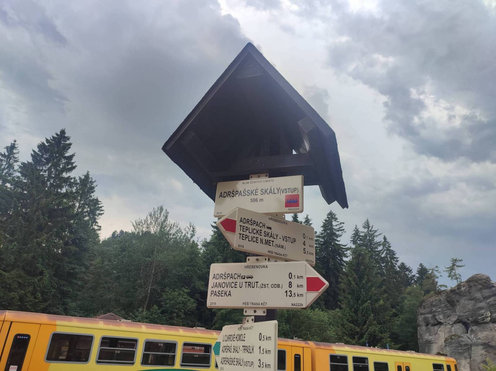 Wycieczkę po skalnym mieście zaczynam na płatnym parkingu w Adrspach. Zatrzymuje się tutaj również kolej. Bilety na parking jak również bilety wstępu warto kupić wcześniej przez internet. Ceny są niższe a i ilość miejsc ograniczona. Niestety nie udało mi się zrealizować planu, gdyż zaczęło dość mocno padać a miałem zamiar udać się jeszcze wąwozem wzdłuż potoku do Teplic. Z Teplic do miejsca startu można wrócić koleją-czas podróży to ok 10 minut.