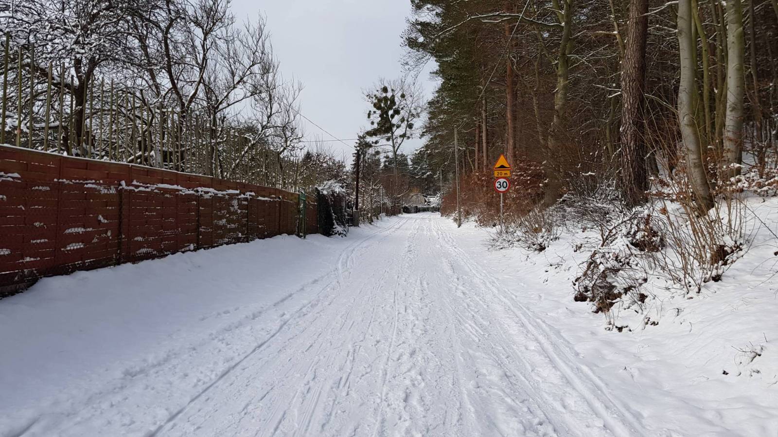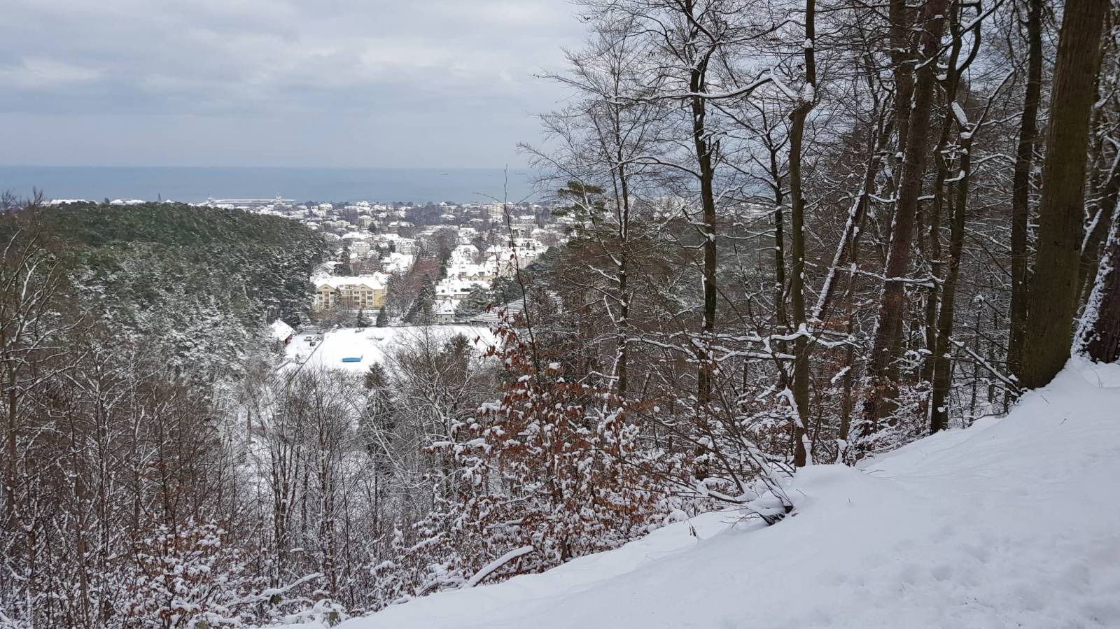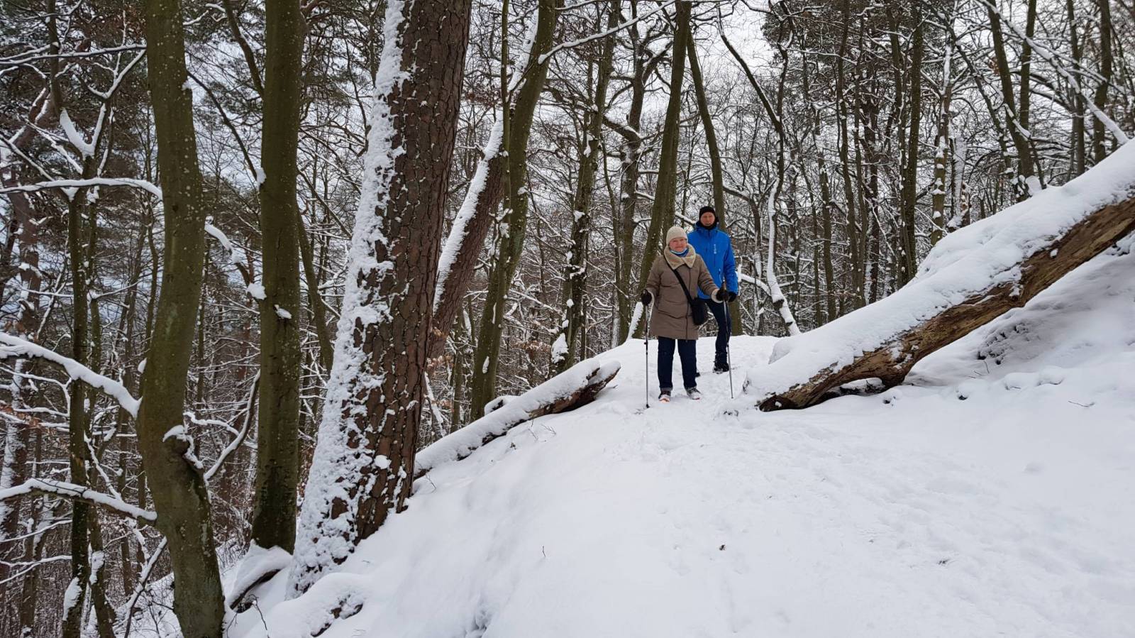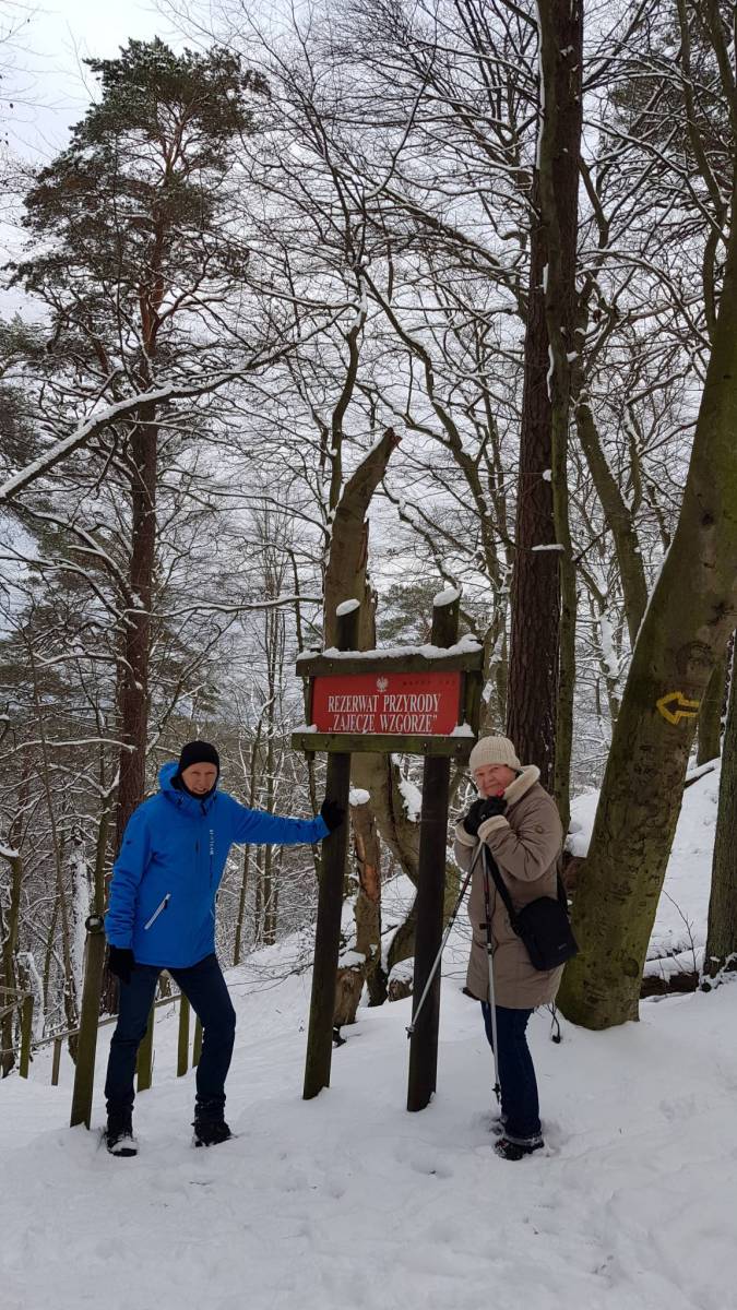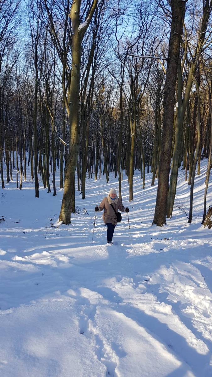 Śnieżna sceneria i trochę słońca dodają uroku spacerowi.