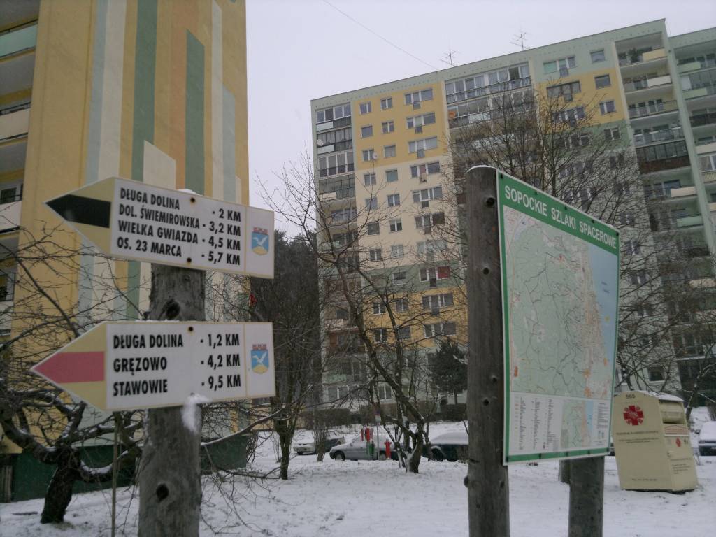 Wespół z „zielonym” szlakiem skręcamy w lewo i grzbietem wzniesienia kierujemy się ku miastu. W miejscu gdzie szlaki rozdzielają się widać wody Zatoki Gdańskiej. Droga zaczyna opadać. Towarzyszą nam okazy różnych drzew, mrowiska. Wzrasta ilość dróg i ścieżek. Wśród niezbyt atrakcyjnych zabudowań warsztatów obiektów przemysłowych osiągamy ul. Czyżewskiego w bezpośrednim sąsiedztwie granic Sopotu i Gdańska.