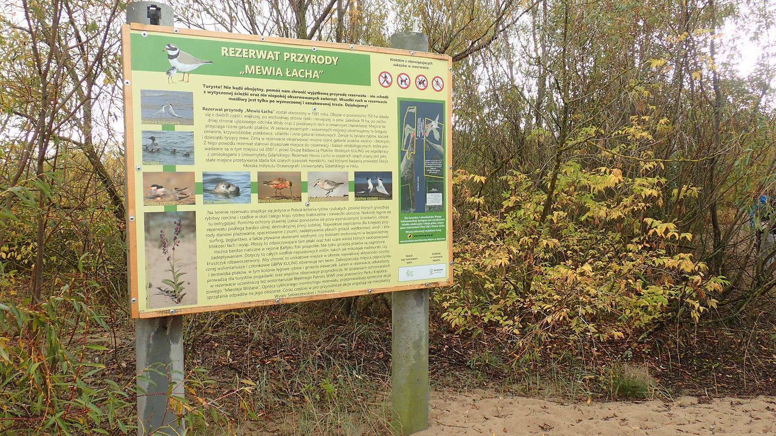 Naszą wędrówkę podjęliśmy z Świbna, miejscowości znajdującej się na Wyspie Sobieszewskiej. W zachodniej części rezerwatu poruszaliśmy się szlakiem pieszym oraz jego częścią dydaktyczną oznakowaną kolorem zielonym. Pierwsza część wędrówki wiodła kamienną groblą wzdłuż ujścia Wisły. Z powrotem natomiast, poruszaliśmy się ścieżką dydaktyczną przez pas wydm oraz plażą, od pierwszego do drugiego wejścia, na terenach Gdańska. Na ścieżce znajdują się dwie platformy widokowe, z których można zaobserwować różne gatunki ptactwa wodnego oraz wylegujące się na piaszczystych łachach foki.