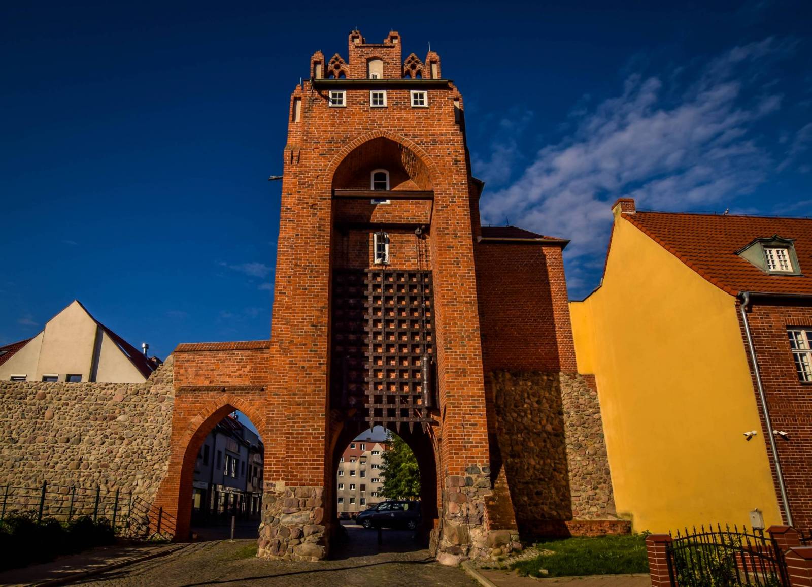 Mury obronne w Strzelcach Krajeńskich otaczają pełnym pierścieniem teren starego miasta, nadając mu kształt zbliżony do okręgu. W obrębie średniowiecznego miasta zachowała się historyczna sieć komunikacyjna, z centralnie usytuowanym rynkiem, ulicami przecinającymi się pod kątem prostym i ulicą ciągnącą się pierścieniem równolegle do obwarowań miejskich. Mury o łącznej długości 1640 m są podzielone na proste odcinki różnej długości (od 27 do 56 m), rozdzielone trzydziestoma sześcioma czatowniami. W części wschodniej murów jest zlokalizowana brama Młyńska, w części północno-zachodniej - Baszta Więzienna. Równolegle do obwarowań przebiega ulica, która tworzy zewnętrzny pierścień wokół starego miasta. Przestrzeń między ulicą a murami zajmują głównie współczesne budynki z ogrodami i miejskie zieleńce. Mury wzniesiono z nieobrobionych i łamanych kamieni polnych, które układano warstwami grubości 60-120 cm, wyrównywano okrzeskami kamiennymi i spajano zaprawą wapienną. Wnętrze wypełniono gruzem kamiennym spojonym zaprawą. U podstawy mury mają grubość ok. 160 cm. Najwyższy zachowany odcinek ma wysokość 850 cm.