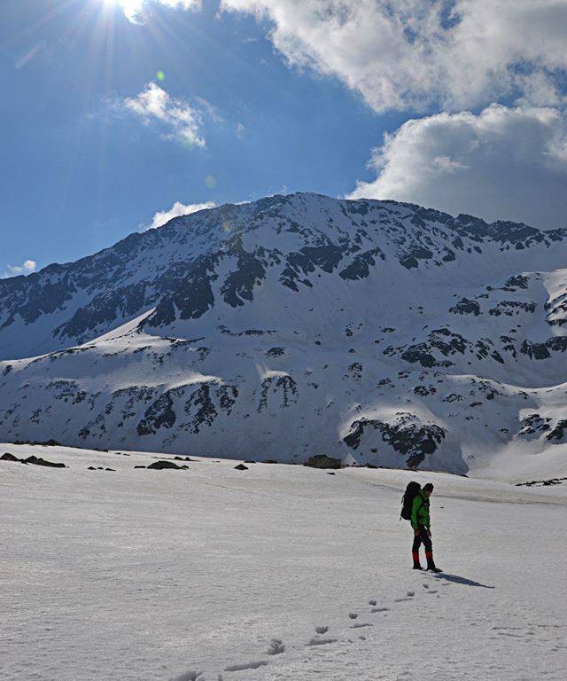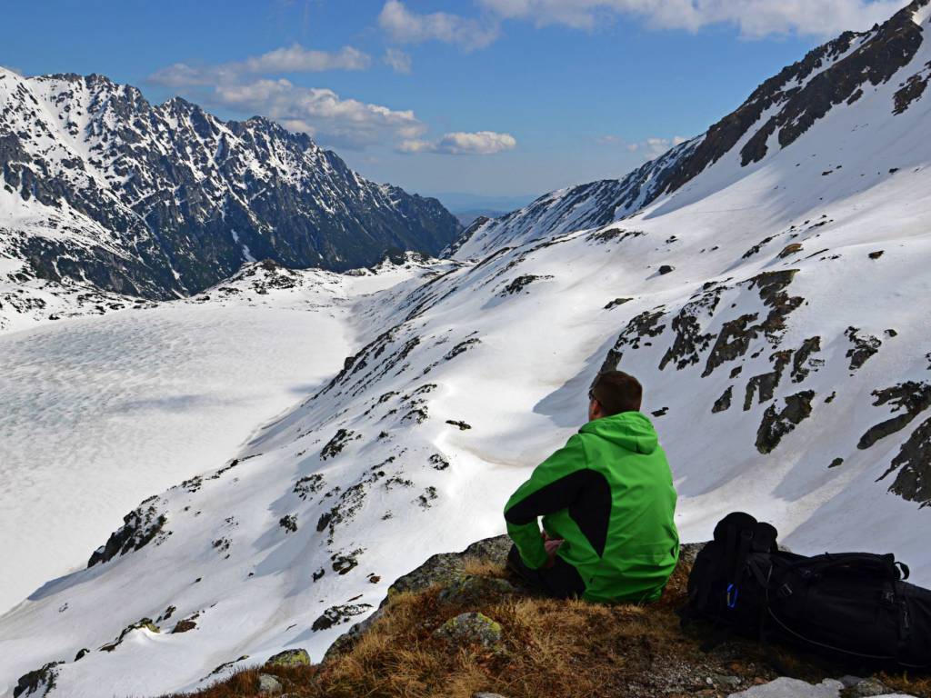 Na wierzchołku jesteśmy chwilę. Robimy zdjęcia i schodzimy z powrotem na przełęcz. Dalsza droga prowadzi w stronę Morskiego Oka, ale najpierw musimy pokonać strome zbocze, zapadając się w głębokim śniegu, który po tej stronie grani jest mokry i kopny. Musimy uważać, żeby się nie obsunąć, bo pod nami ze zbocza sterczą całe grupy skał. Lawirując powoli między nimi, dochodzimy do miejsca, gdzie teren się wypłaszcza i brniemy dalej w kopnym śniegu do Doliny za Mnichem, a następnie w stronę schroniska nad Morskim Okiem. Przed schroniskiem zatrzymujemy się na dłużej. Zamawiamy piwo i szarlotkę i korzystamy ze słońca. Po południu z tłumu turystów uciekamy do zacisznego schroniska w Roztoce, które chyba jest naszym ulubionym tatrzańskim schroniskiem. Dzień kończymy przy kolejnym piwie i kolejnej szarlotce. Ta roztocka smaczniejsza.