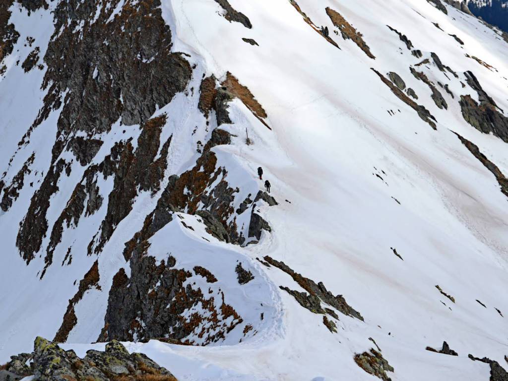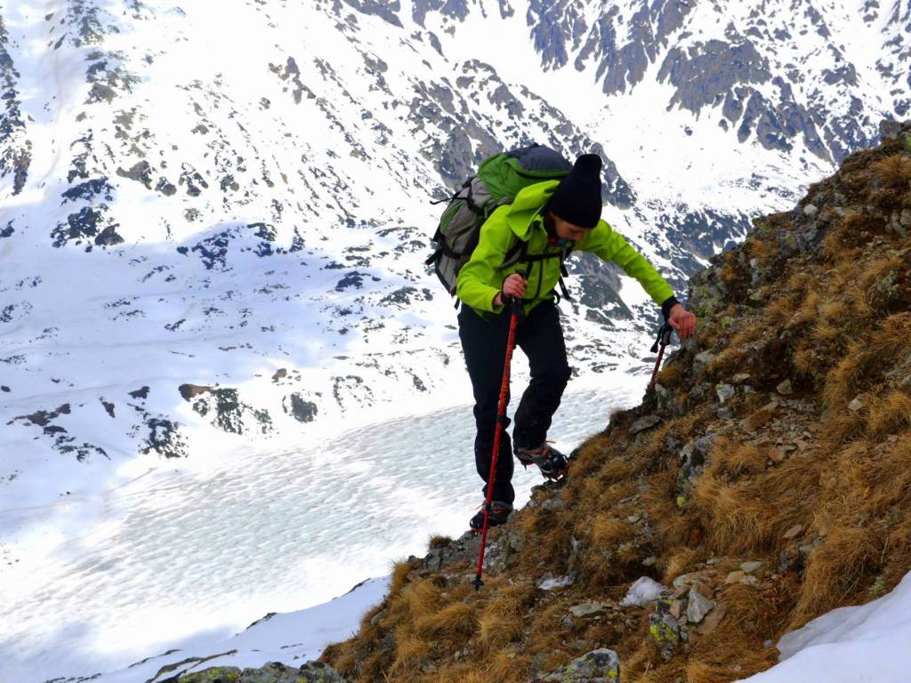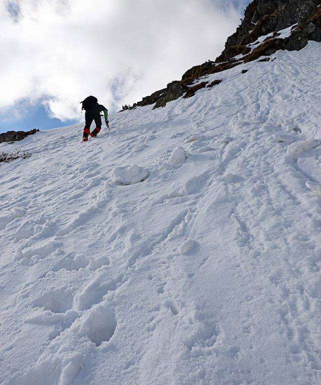 Podchodzimy trochę pod górę i zaczynamy trawers dość stromego zbocza. Śnieg, mimo wieczornego deszczu, jest dobrze związany i stabilny. Niepokoi nas tylko trochę duże nasłonecznie stoku, który pokonujemy wszerz. Wszak jest drugi stopień zagrożenia lawinowego. Po około 200 metrach trawersu musimy podejść kawałek prosto w górę po bardzo stromej ścianie. Na szczęście śnieg dobrze trzyma raki i czekan i po dłuższej chwili wychodzimy na grupkę skał wystających ze zbocza, na których możemy usiąść, zjeść drugie śniadanie i podziwiać Dolinę Pięciu Stawów Polskich z góry.