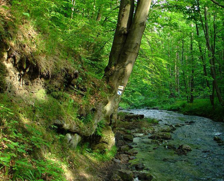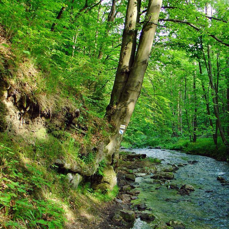 Droga sprowadza nas w dół. Skręcamy w prawo za znakami żółtego szlaku. Trzysta metrów dalej opuszczamy ostatecznie asfaltowy trakt i po przekroczeniu kładki znikamy w objęciach wąskiej doliny porośniętej lasem. Latem, gdy z nieba leje się żar, korony drzew użyczają turystom przyjemnego chłodu. Idziemy brzegiem potoku. Szum wody i chrzęst kamyków pod butami szybko koi stargane miejskim życiem nerwy.