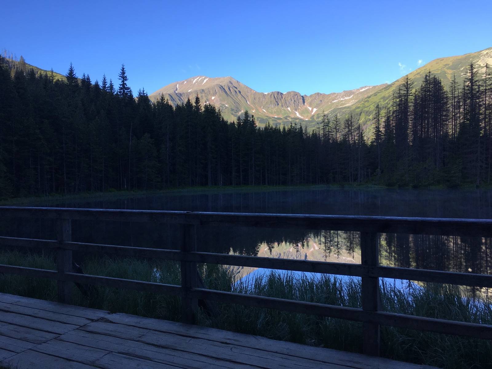 Staw Smreczyński z rana. Krótki marszobieg na rozgrzewkę przed dalszą drogą. GPS coś mi wariuje więc musiałem edytować ślad.Sam staw jak dla mnie bez szału. Widok podobny jak spod schroniska.