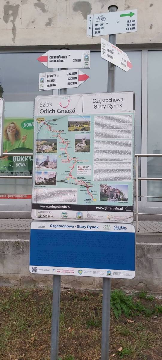 Mapa Jury Krakowsko-Częstochowskiej, fragmentu położonego bliżej Częstochowy. Zasięg mapy wyznaczają miejscowości: Częstochowa, Blachownia, Pajęczno, Radomsko. Zaznaczono tu szlaki piesze, rowerowe i konne wraz z zaznaczonymi odległościami.
