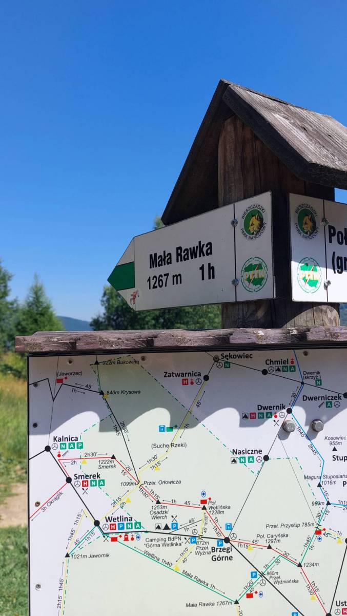 Mapa Bieszczadów w okolicach Cisnej - miejscowość jest wcentralnej części mapy. Na mapie znajdują się miejscowości: Jabłonki, Zatwarnica, Łopienka, Wetlina, Balnica. Znajdziemy tu trasy rowerowe, szlaki piesze i ścieżki przyrodniczo-edukacyjne. Podane są długości czasu przejść. Rok wydania 2022