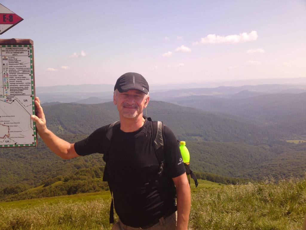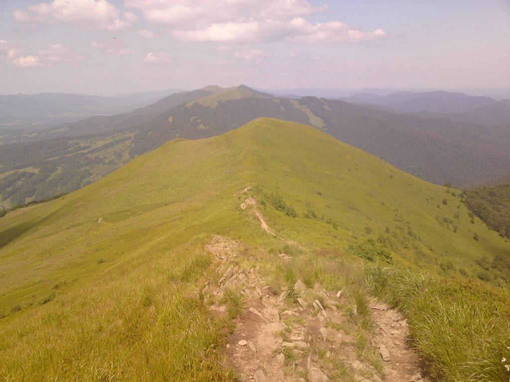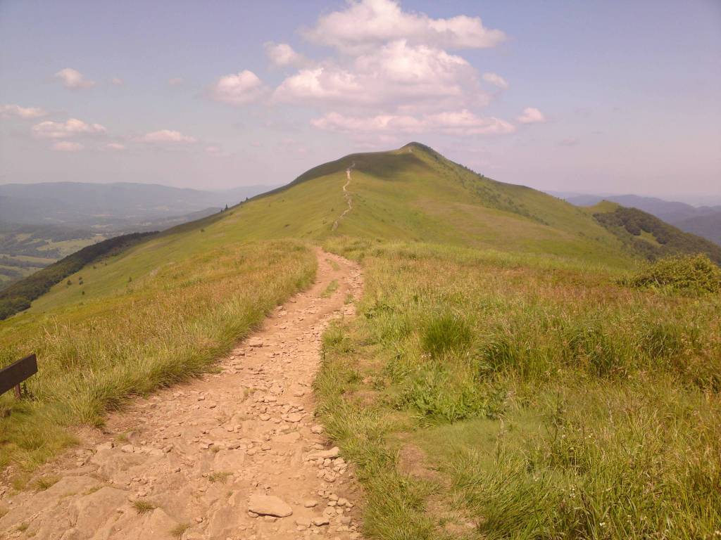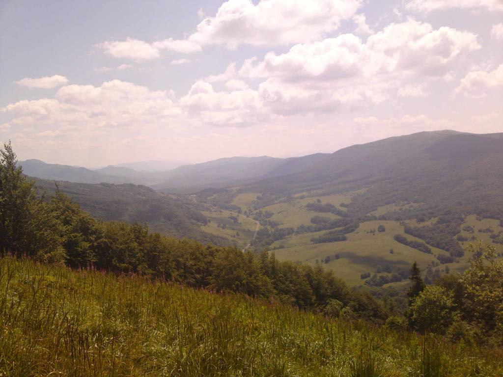Wstępuję do sklepu , kupuje dwie drożdżówki i kieruję się w stronę dużego parkingu gdzie zaczyna się szlak na Połoninę Caryńską . Najpierw „budka” gdzie trzeba uiścić opłatę za wstęp do parku – 6 złotych i ruszam ostro pod górę . Dobrych kilkaset metrów mozolnie pnę się w gorę . Po wyjściu z lasu otwiera się piękna panoram połonin i wtedy zapomina się o wszystkim . Przechodzę dość szybko połoninę Caryńską i schodzę w dół . Nie wiem , czy nie wolałbym podchodzić . W końcu osiągam Brzegi Dolne. Tutaj znowu „okienko kasowe „ i płatny parking dla tych , którzy tutaj zaczynają podejście na Połoninę Wetlińską . Teraz znowu potężne wejście na szczyt połoniny. Zbliża się południe , jest upalnie a ruch na trasie bardzo dużo mimo dnia powszedniego. Mimo wszystko dość szybko osiągam schronisko PTTK Chatka Puchatka.