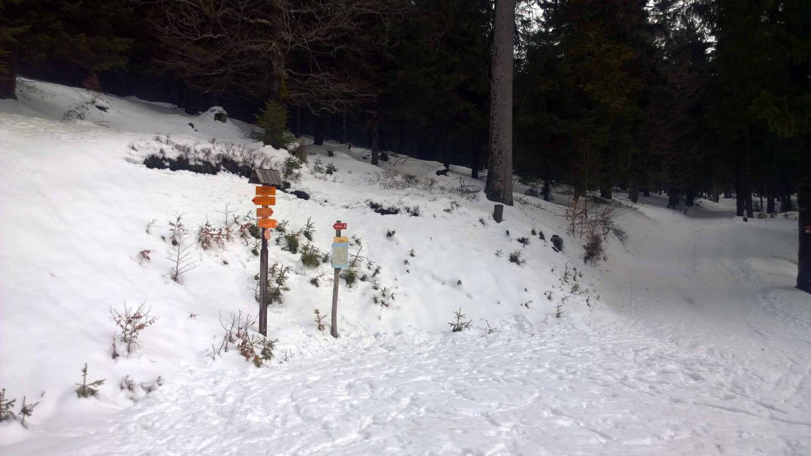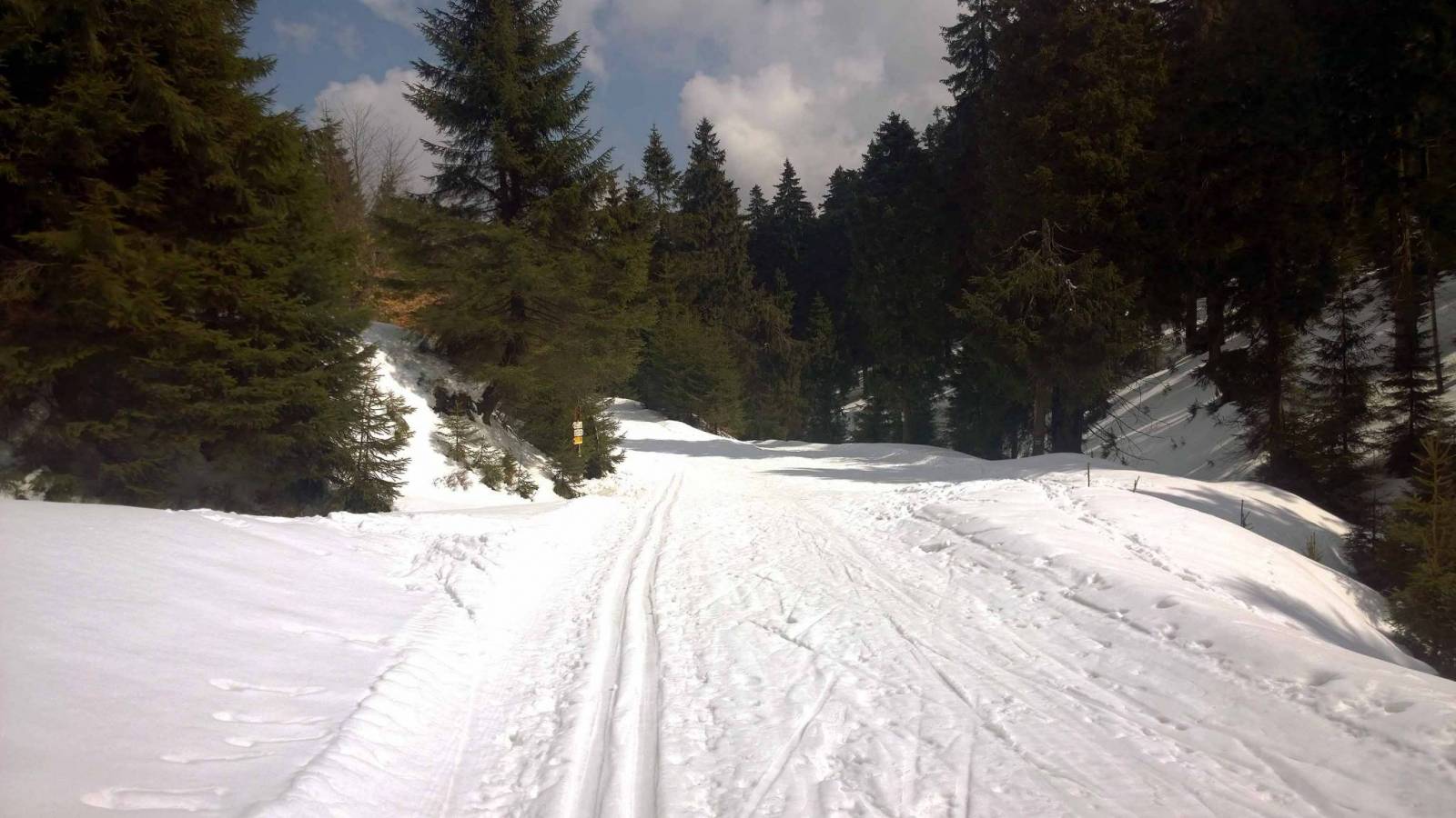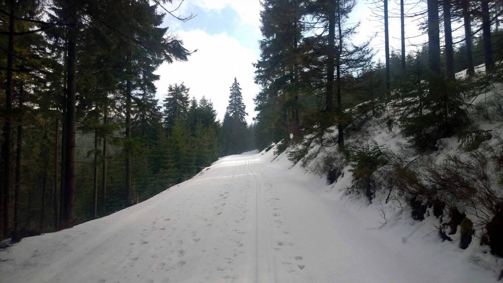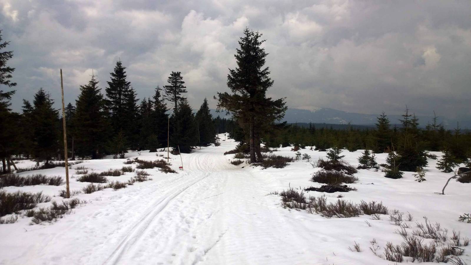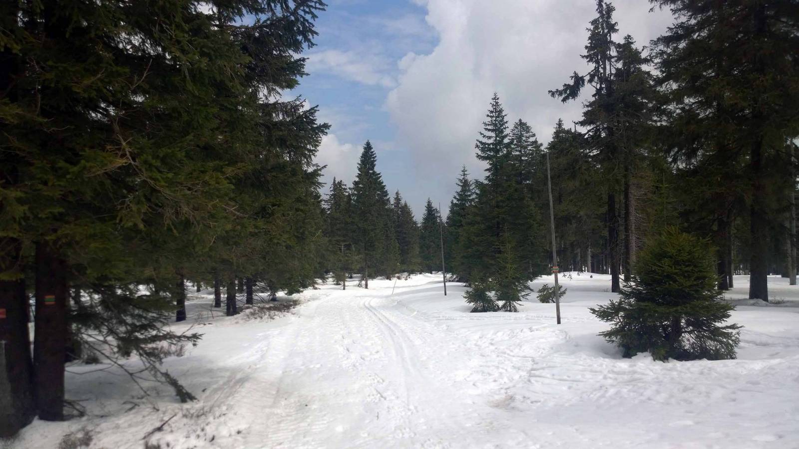 Niby już tydzień temu w Jakuszycach zakończyłem sezon , ale ta zima jest inna niż poprzednie. Świeże dostawy śniegu , ratraki wyszły na trasy w weekend . Trzeba spróbować . Auto zostawiam na pustym parkingu w Nowej Morawie . Śniegu pod dostatkiem , jest dobrze. Początkowo śnieg twardy , rano było około 0 . Ale im wyżej tym cieplej , śnieg miękki . Liczyłem ,że za Suchą Przełęczą będzie lepiej . Ale z każdą godziną było cieplej . Zatrzymuje się koło schroniska Paprsek . Jest zamknięte . Kanapki , herbata z termosu i w drogę . Dziś biegnę Wielkim Szengenem . Więc przede mną Travna Hora . Po polskiej stronie spotykam znajomego . Adam też biegnie z Morawy , ale on tak naprawdę zaczyna . Z trudem dobiegam do Suchej Przełęczy . 4 km zjazdu to walka z miękkim śniegiem . Ufff chyba mam dosyć . To już chyba dla mnie koniec sezonu bo śniegu pewnie starczy do majówki