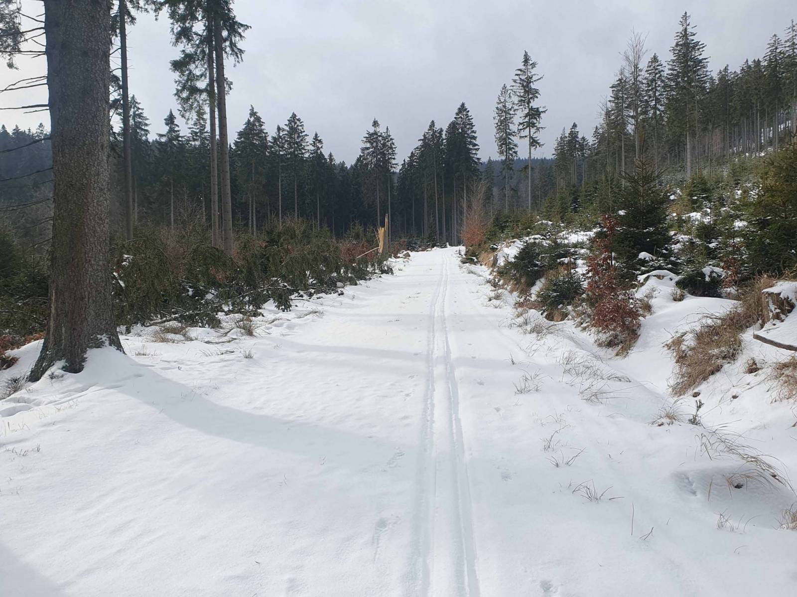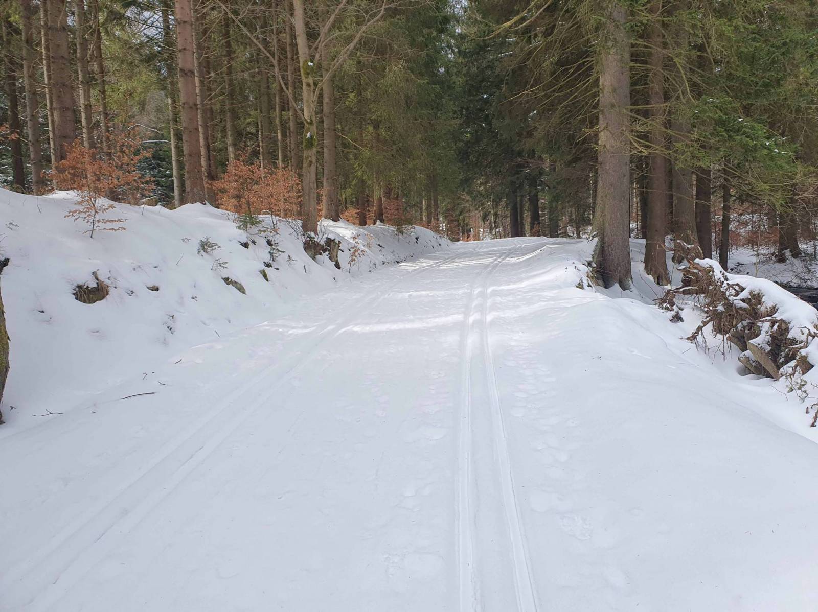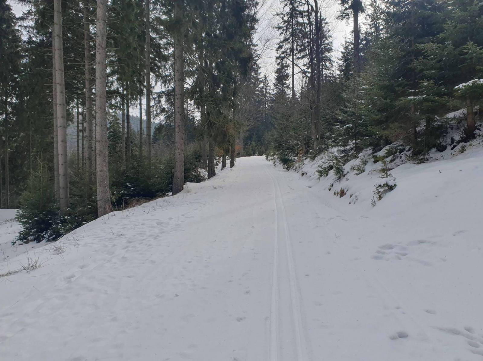 Około 10 parking w Bielicach prawie pusty . Ratrak dziś nie jechał , ale śniegu nie napadało wiele a dodatkowo ktoś już rano tu biegał . Ruszam pętlą Rezerwatową w stronę Wielkiego Szengena . momentami wyglądało słońce , tylko strasznie wieje . Na Wielkim Szengenie rano jechał ratrak . Warunki fantastyczne . Do Papryska spotkałem kilka osób . W schronisku szybki posiłek . Ludzi sporo , ale obsługa uwija się , więc długo się nie czeka . Potem biegnę jeszcze na Travną Horę i pętlą Rezerwatową wracam do parkingu
