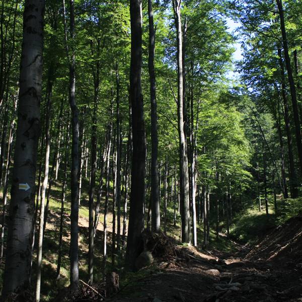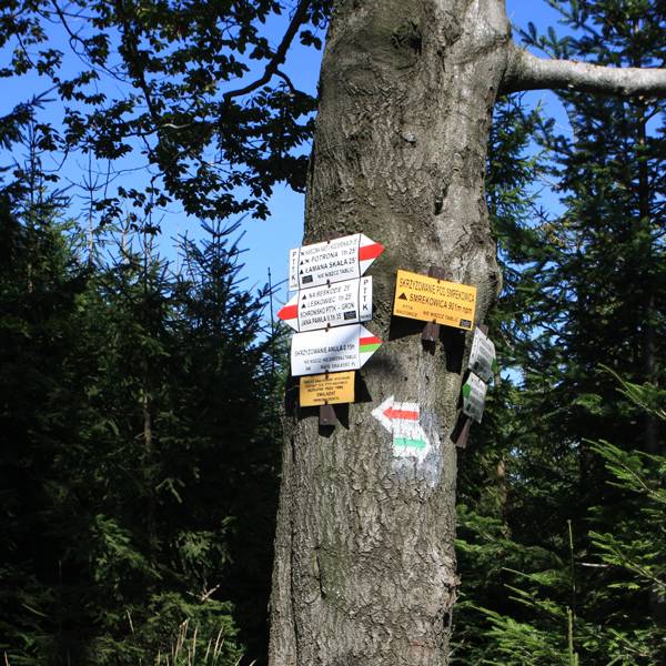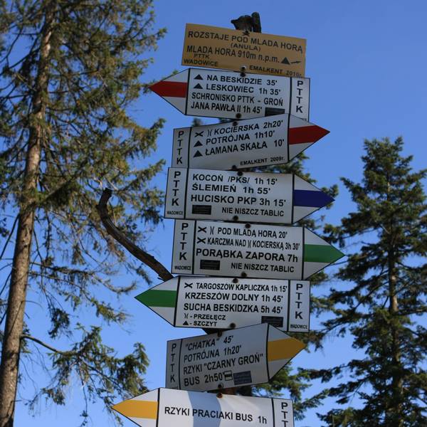 Wycieczka rowerowo-piesza w Parku Krajobrazowym Beskidu Małego. Rozpoczynamy od Inwałdu (6 km od Andrychowa i 6 km od Wadowic), gdzie można jest Park Miniatur "Świat Marzeń" (który został otwarty w maju 2007 r. na powierzchni 45.000 m2) oraz Park Rozrywki Dinolandia. Około 4 km jedziemy drogą 52, w centrum Andrychowa skręcamy w lewo w ul. Garncarska, później Dąbrowskiego, aż do Rzyków. Tam skręt w prawo i zejdziemy do końca drogi (mijamy wieś Podlachoń i po prawej mijamy ośrodek Czarny Groń - centrum narciarskie, całoroczny ośrodek wypoczynkowy, park linowy, oberża, lodowisko). Na końcu drogi parking (tu można zostawić rower - bo i tak całej trasy nie da się nim przejechać, a pieszo robimy pętelkę do tego samego miejsca), skąd wyruszamy na pieszą wycieczkę. Z parkingu zaczyna się żółty szlak turystyczny prowadzący prosto na Łamaną skałę (według znaków 1,5 godziny). Po 5 minutach po prawej widać wyciąg narciarski. Mijamy strumyk i zaczynami powoli piąć się pod górkę. Ze szlaku żółtego skręcamy w lewo i korytem strumyka pniemy się ostro w górę, po około 40 minutach docieramy do grani (po lewej mamy szczyt Sutrekowicy - 863 m npm), gdzie wkraczamy na szlak czerwony. Szlakiem idziemy w prawo i po 10 minutach docieramy do głównego "skrzyżowania" górskiego (szlak czerwony, czarny, żółty, zielony i niebieski). Dalej podążamy za szlakiem czerwonym. Po 10 minutach mijamy szczyt ŁAMANEJ SKAŁY i wkraczamy do rez. Madohora (rezerwat leśny "Madohora" w Górach Zasolskich obejmuje podszczytowy rejon Łamanej Skały przy szlaku czerwonym Leskowiec - Przełęcz Kocierska. Utworzony w 1960 r. Powierzchnia 71,8 ha. Dolnoreglowa buczyna karpacka, w partii szczytowej zbiorowiska świerczyny typowej dla regla górnego. Świerki posiadają tu charakterystyczne korony w kształcie stożków i są ugałęzione do samej ziemi. Z osobliwości florystycznych występuje rzeżucha trójlistkowa i specjalne gatunki mchu). Po około 20 minutach po prawej znów widzimy wyciąg narciarski (ten sam co na początku wycieczki pieszej), tak więc, aby zaoszczędzić dużo czasu, schodzimy w dół wzdłuż wyciągu, po 20 minutach jesteśmy z powrotem na żółtym szlaku i po kolejnych 5 - z powrotem w punkcie wyjścia, gdzie zostawiliśmy rowery.