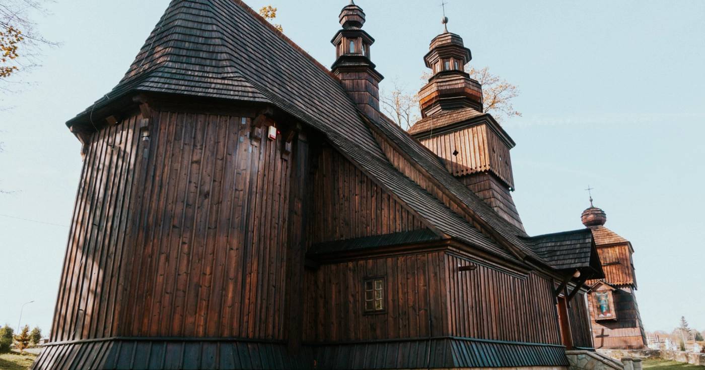 Prezentujemy wycieczkę rowerową przez Pasmo Jasielskie, połączoną z wizytą w Muzeum Przemysłu Naftowego i Gazowniczego w Bóbrce. Trasa jest krótka, lecz zawiera dwa wymagające podjazdy i w całości prowadzi po drogach asfaltowych. Chociaż teoretycznie jedziemy szlakiem rowerowym Beskidzkie Muzea, to niestety w wielu miejscach nie ma oznakowań na trasie. Nie stanowi to jednak większego problemu, ponieważ pętla jest łatwa do nawigacji. Można rozpocząć wycieczkę bezpośrednio przed muzeum, lecz w sezonie może być problem z zaparkowaniem samochodu, dlatego sugerujemy start po drugiej stronie Pasma Jasielskiego – przed kościołem w Łękach Dukielskich. Z parkingu zjeżdżamy na zachód do Kobylan, gdzie skręcamy w prawo. Nieco wyżej mijamy kościół i kontynuujemy łagodny podjazd. Na granicy lasu przecinamy Pasmo Jasielskie. Po krótkim stromym odcinku, długim zjazdem docieramy do Chorkówki. Na obrzeżach wsi skręcamy w prawo i kierujemy się do Bóbrki. Widoczna z daleka wieża kościoła wskazuje nam kierunek jazdy na kolejnych rozwidleniach. Główną drogą w prawo opuszczamy Bóbrkę. Dość wymagający podjazd w lesie kończymy przy wejściu do Muzeum Przemysłu Naftowego i Gazowniczego.