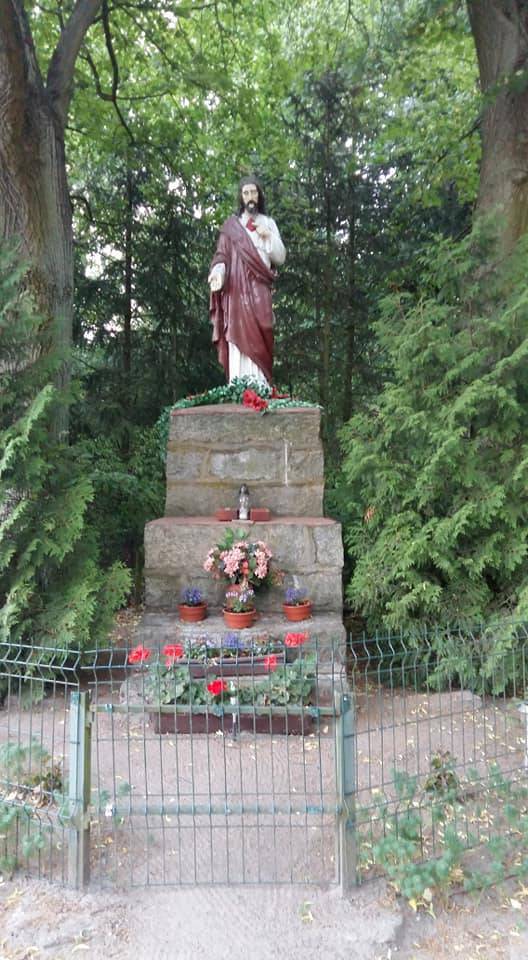 Na rozdrożu przy figurze skręcamy w prawo i kierujemy się drogą polną aż do drogi asfaltowej gdzie skręcamy w prawo.