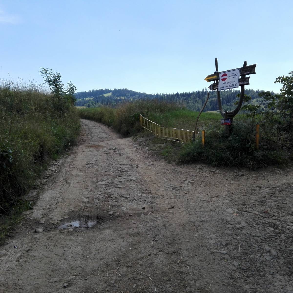 Wycieczkę do Bacówki PTTK na Maciejowej a dokładnie na polanie Przysłop 852 m n.p.m. rozpoczynamy w Rabce z parkingu obok Śląskiego Centrum Rehabilitacyjno-Uzdrowiskowego przy ul.Dietla. Biegnie tędy czerwony Główny Szlak Beskidzki w kierunku Turbacza. Szlak wspina się asfaltową drogą między zabudowaniami po czym przechodzi w polną szutrową drogę. Idąc malowniczymi beskidzkimi polami z których rozpościera się piękna panorama na Rabkę i Beskid Wyspowy dochodzimy do lasu i wspinamy się pod górną stację narciarską na Maciejowej. Nad stacją szlak biegnie łagodnie przez las po czym delikatnie w dół aż do zakrętu za którym wyłania się Polana Przysłop i nasz cel, Bacówka PTTK na Maciejowej. Bardzo przyjemne miejsce z klimatycznym wnętrzem i smacznym jedzeniem. W pogodne dni można podziwiać widoki zarówno Beskidu Wyspowego jak i w kierunku Babiej Góry czy Tatr. Trasa przyjemna z jednym ostrzejszym ale krótkim podejściem. Przebyłem z ośmioletnią córką więc polecam na rodzinne wypady.