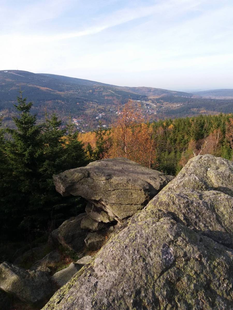 Od Rozdroża zmieniamy szlak na zielony i mamy małą wspinaczkę do rozdroża pod Zawaliskiem i dalej w miarę spokojnie szlakiem czerwonym wchodzimy na Wysoki Kamień gdzie jest bufet i fajny punkt widokowy . Z wysokiego schodzę na dół do Szklarskiej dalej szlakiem czerwonym i po przebiciu się przez miasto zaczynam wspinaczkę na Szrenice.