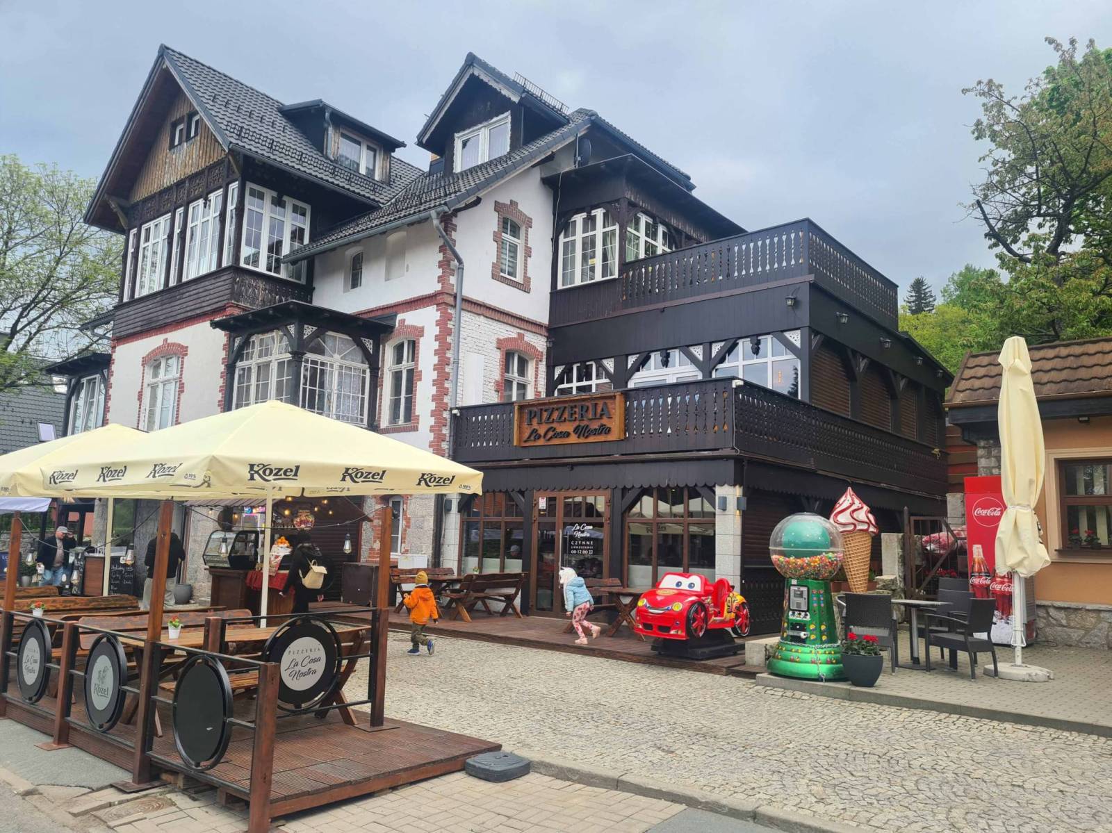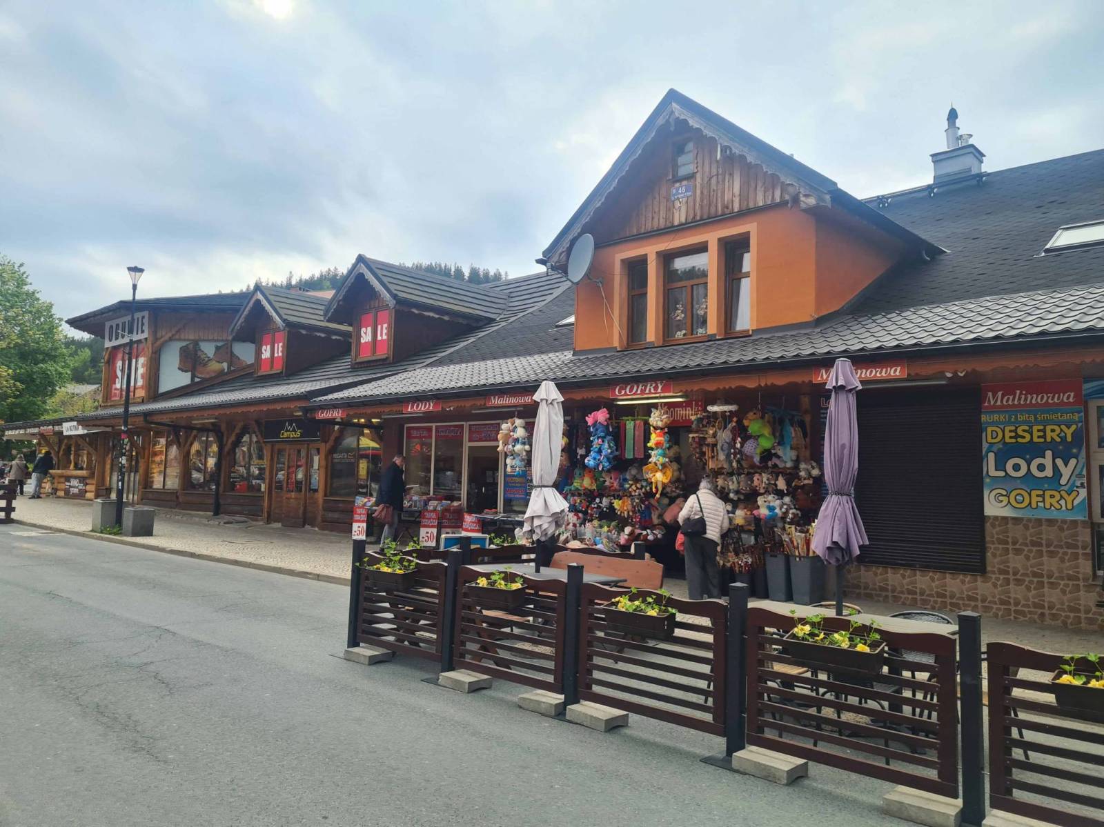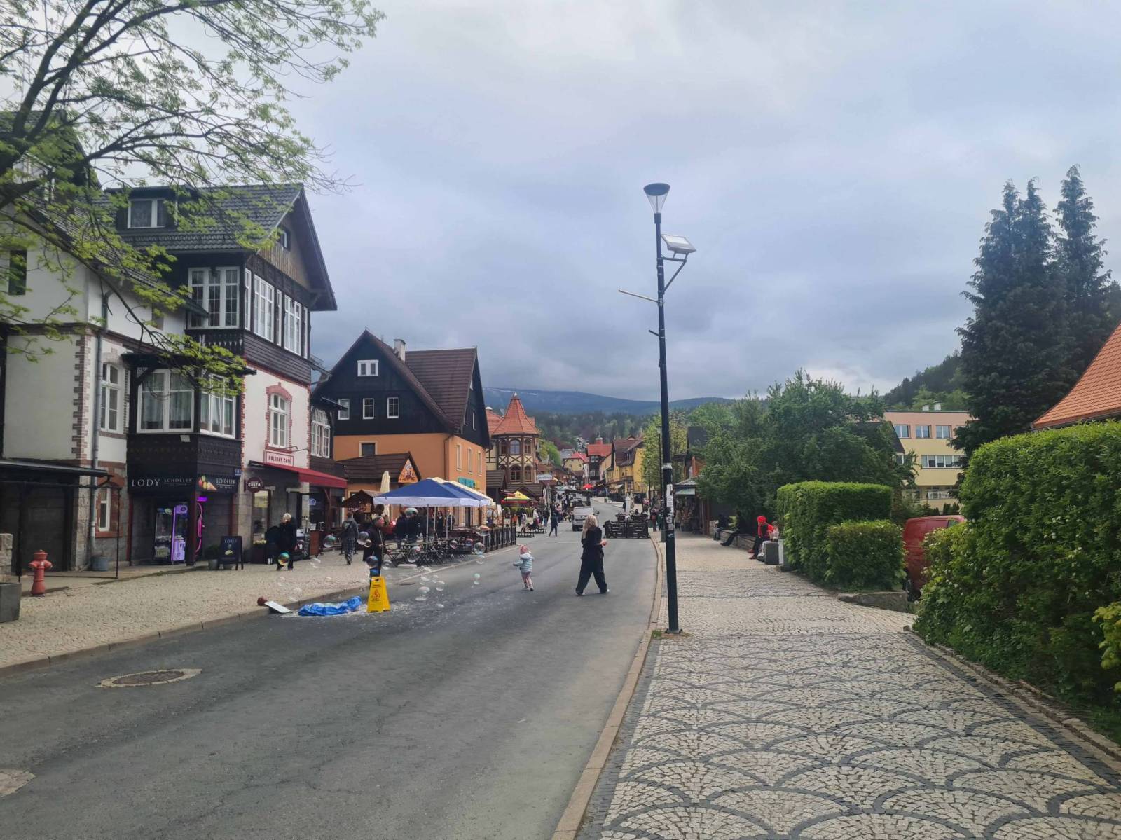 Spacerek do schroniska Samotnia nie okazał się zbyt męczący . Po krótkim odpoczynku , z Wilczej Poręby spacer do centrum Karpacza . Kiedyś był tu las , teraz osiedle typowo "pensjonatowe". Do Karpacza można dojechać asfaltową drogą , lub dojść wygodną ścieżką . W Karpaczu urodzinowe zjazdu na górskiej kolejce i powrót do resortu .