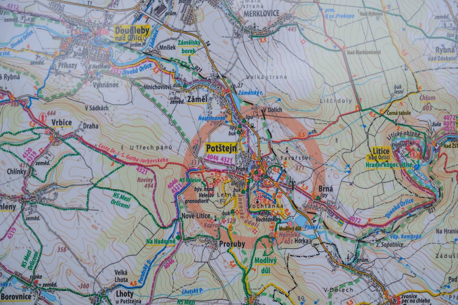 Położone na granicy polsko-czeskiej Góry Orlickie to najwyższy masyw Sudetów Środkowych (najwyższy szczyt – Wielka Desztna (Velká Deštná), 1115 m n.p.m.). Większość masywu znajduje się w Czechach. Po polskiej stronie główne centra turystyczne to Duszniki-Zdrój (baza wypadowa w przyległe pasma) oraz wieś Zieleniec - znany ośrodek narciarski. Mapa obejmuje także polską część Gór Stołowych, pasma górskiego znanego z wyjątkowych formacji skalnych.