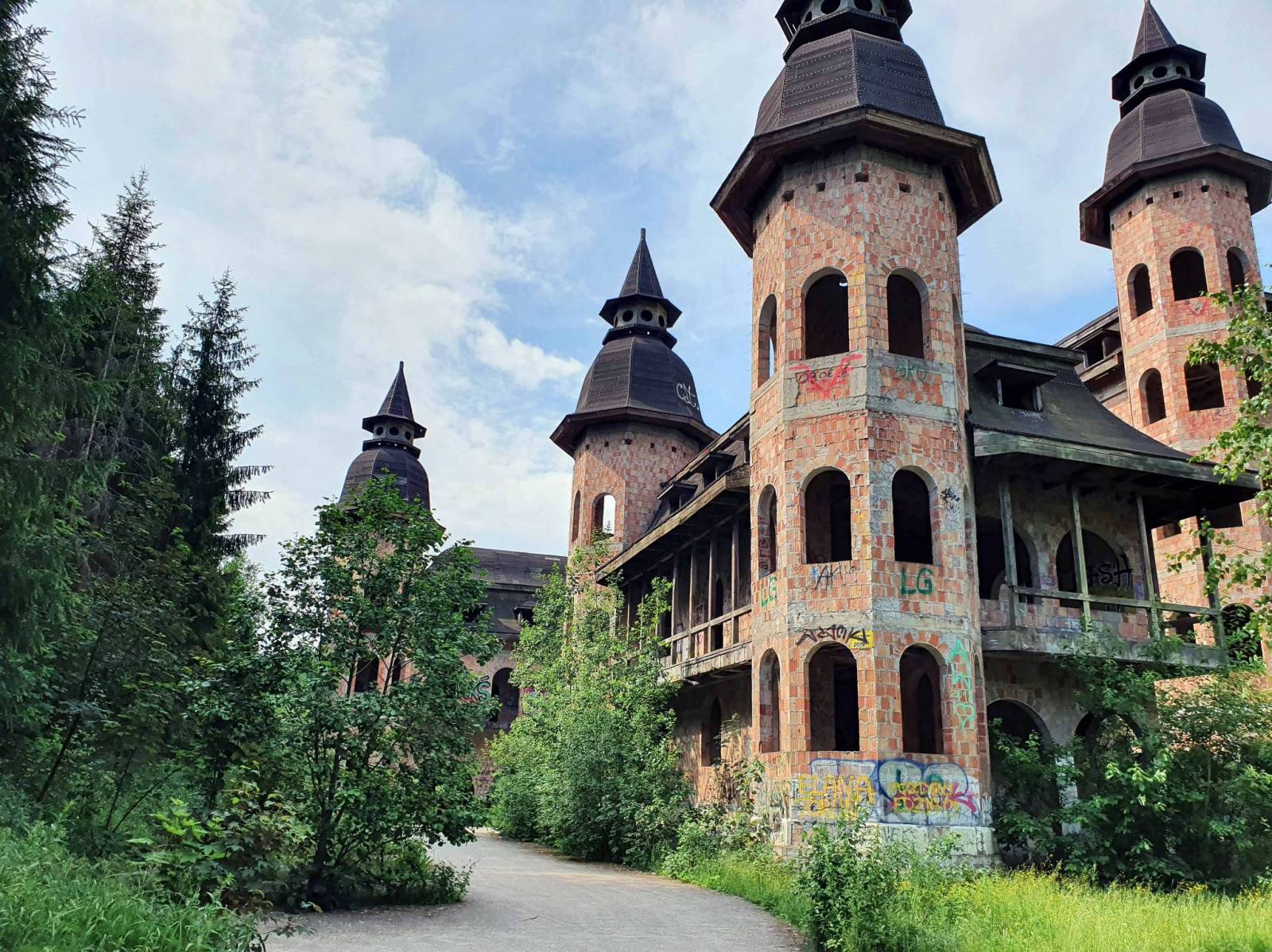 Zamek , czy to pałac , chyba nie jest najważniejsze . W Łapalicach stoi ruina budynku , który wzbudza zainteresowanie , sensacje . Podobno w szczycie sezonu nie można znaleźć tu miejsca aby zaparkować . Z ciekawości , a jakże by inaczej pojechałem tam rowerem . Już przy betonowym ogrodzeniu jakaś para poinformowała mnie jak wejść na niestrzeżony teren. O tej porze roku było tam kilka osób i można było spokojnie obejść pałac . Wrażenie robi rozmach z jakim budowę prowadzono , tym bardziej że miał tam stać trochę większy budynek z warsztatem snycerskim . Na ścianach budynku pojawiło się graffiti , które czasami też jest warte obejrzenia . Podobno ma tu powstać hotel , myślę ,że dobrze.