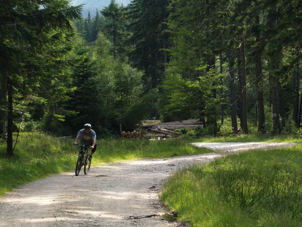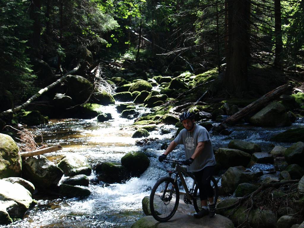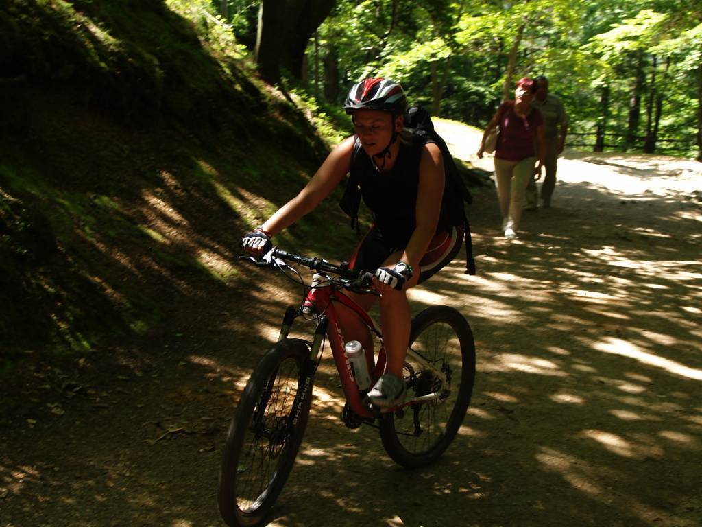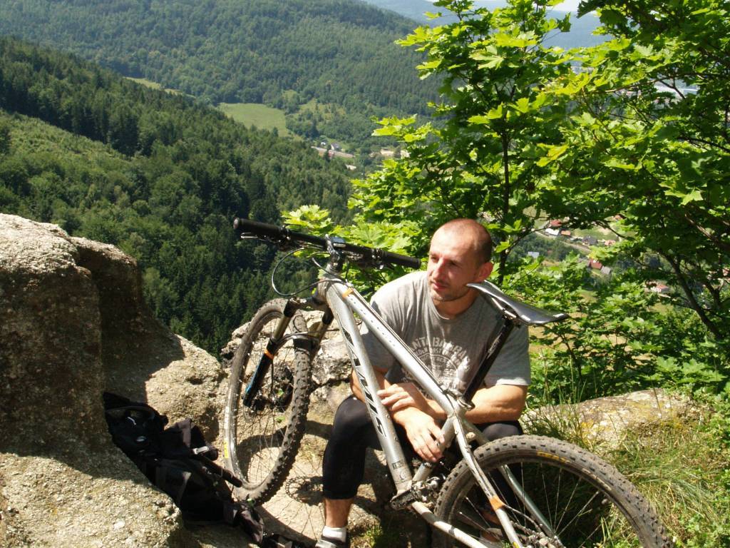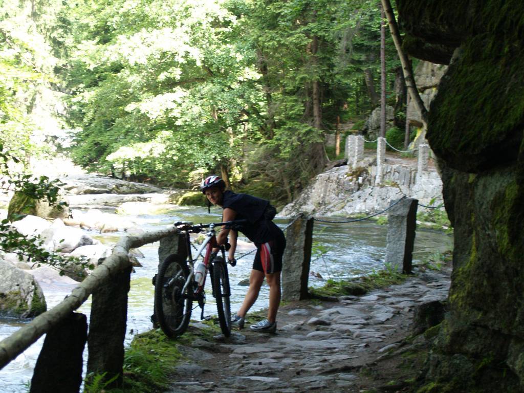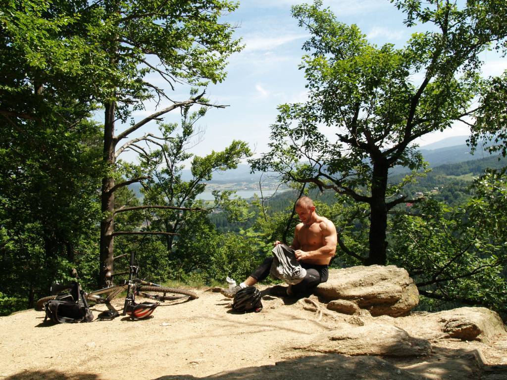 Wypad w stronę Sobieszowa i na Zamek Chojnik. Od samego początku nie szło zbyt łatwo. Zgubiliśmy nieco kierunek. Początkowo w zamyśle miał być przejazd wyższymi partiami jednak omyłkowo zjechaliśmy w dół w stronę Wodospadu Szklarki i nieszczęśliwie musieliśmy przemieszczać się pieszym zielonym szlakiem. Część tej trasy rower pokonał na ramionach. Dalej było już łatwiej. Nawet sam podjazd pod Chojnik czerwonym szlakiem okazał się niezbyt uciążliwy. Ostatnie parę metrów trzeba było rower przenieść, reszta trasy całkowicie do przejechania. U góry kilka fotek i przerwa na chałwę. Wracamy zdecydowanie ciekawszą trasą - Drogą pod Reglami.