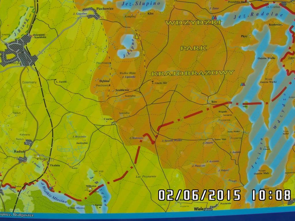 Mapa przedstawia szlak kajakowy rzeką Wdą od miejscowości Śluza do Klanin. Na mapie zaznaczono kilometraż rzeki oraz obiekty istotne dla kajakarza takie jak miejsca niebezpieczne, przeszkody na trasie spływu, pola biwakowe. Mapa jest zorientowana zgodnie z kierunkiem płynięcia.